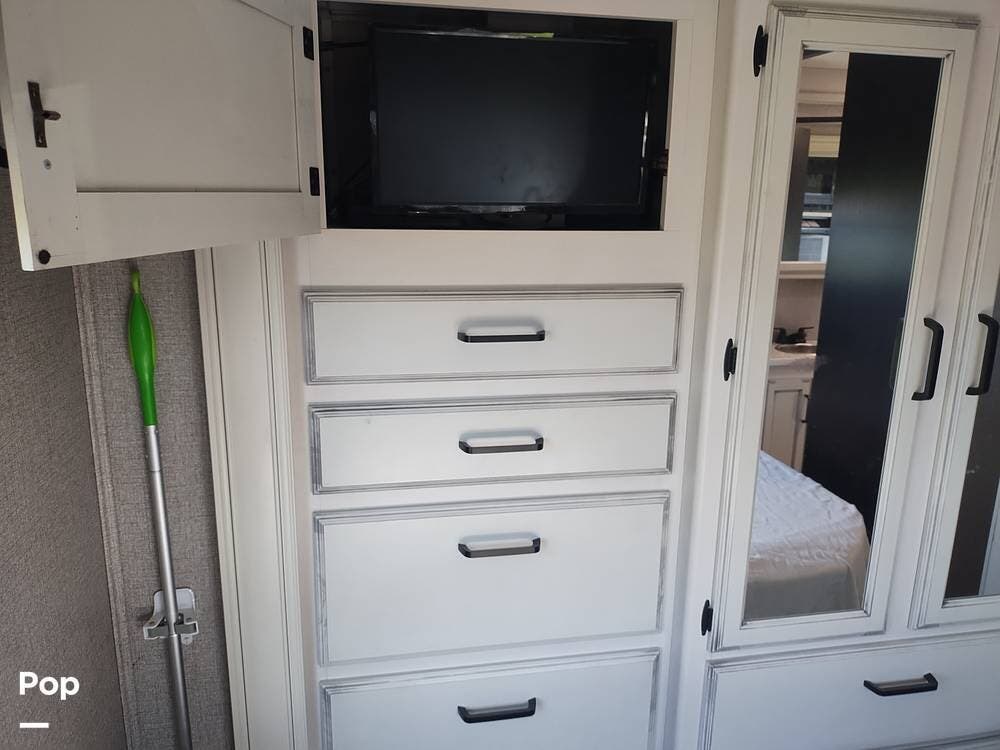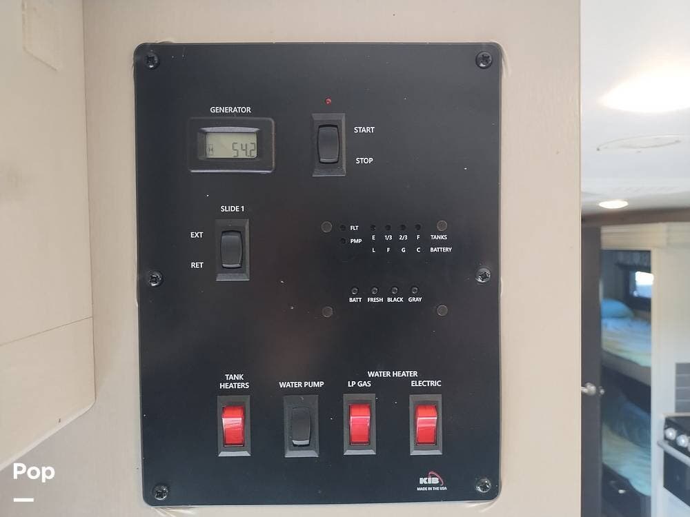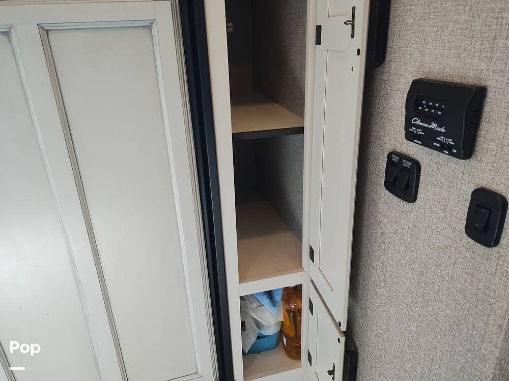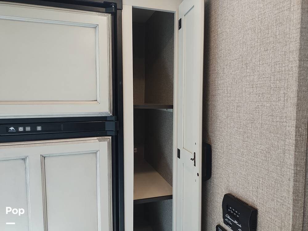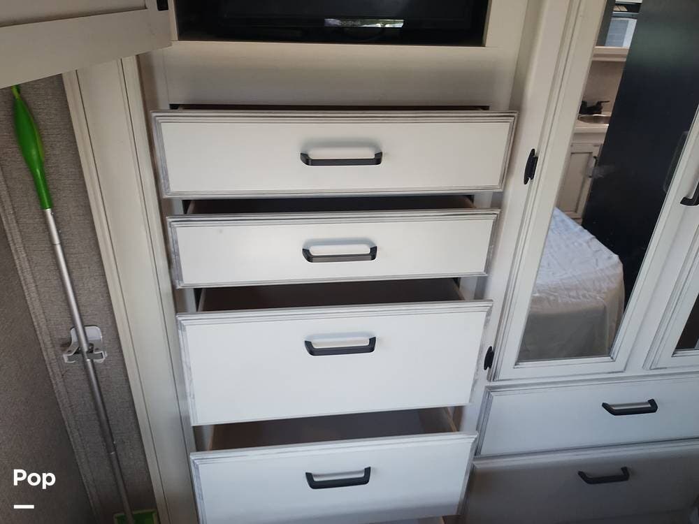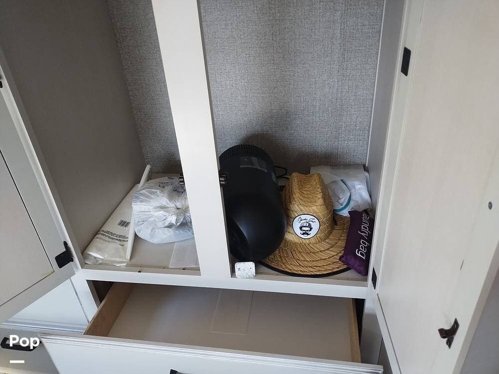 It features one queen bed in the rear bedroom and one cab-over bed with an industry-leading 750 lb. rating, which can remain ready for use. The driver's side bunk area, opposite the bath, features lights and power for a monitor or tablet, along with a privacy curtain and large storage drawers under the lower bunk. The dinette converts to an overflow sleeping area, and the sofa converts to a full-size bed.