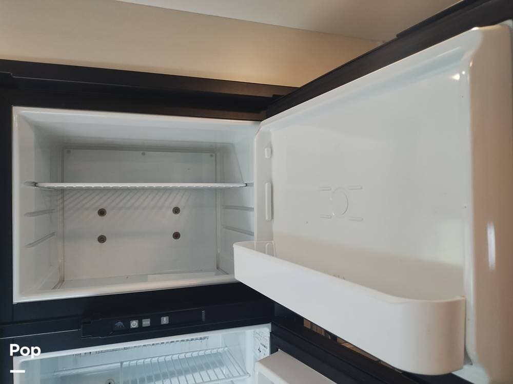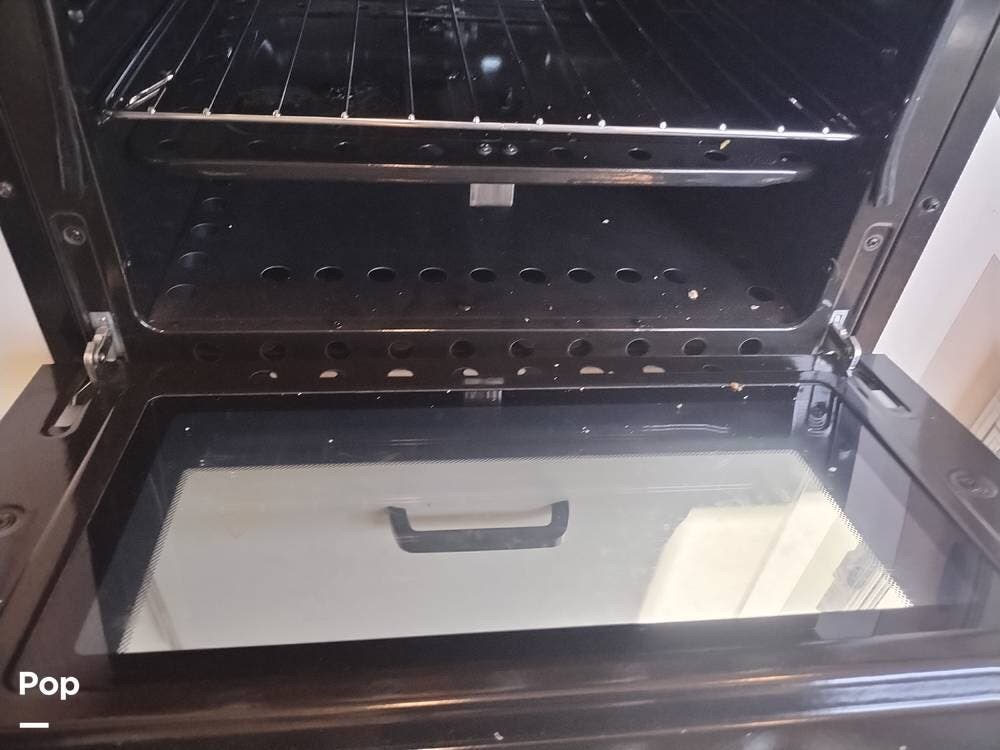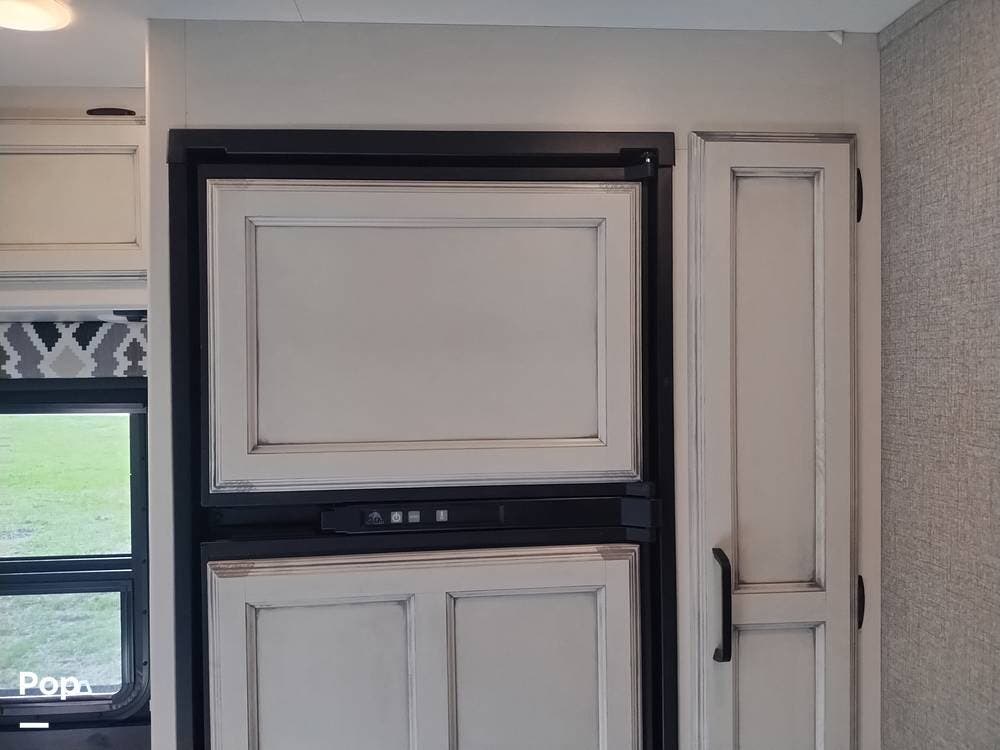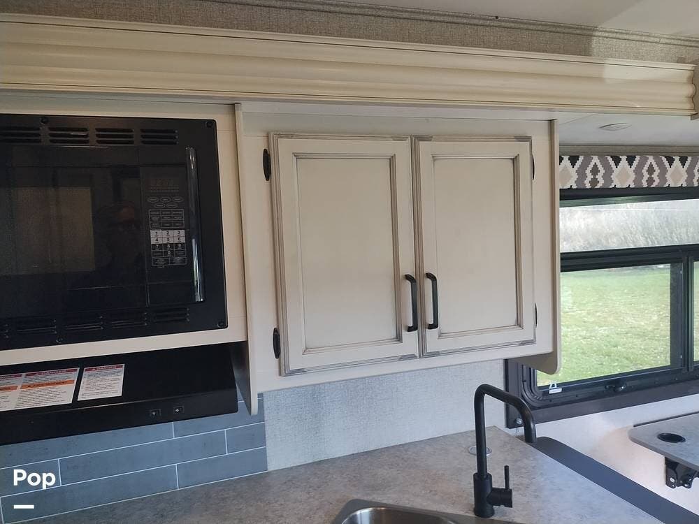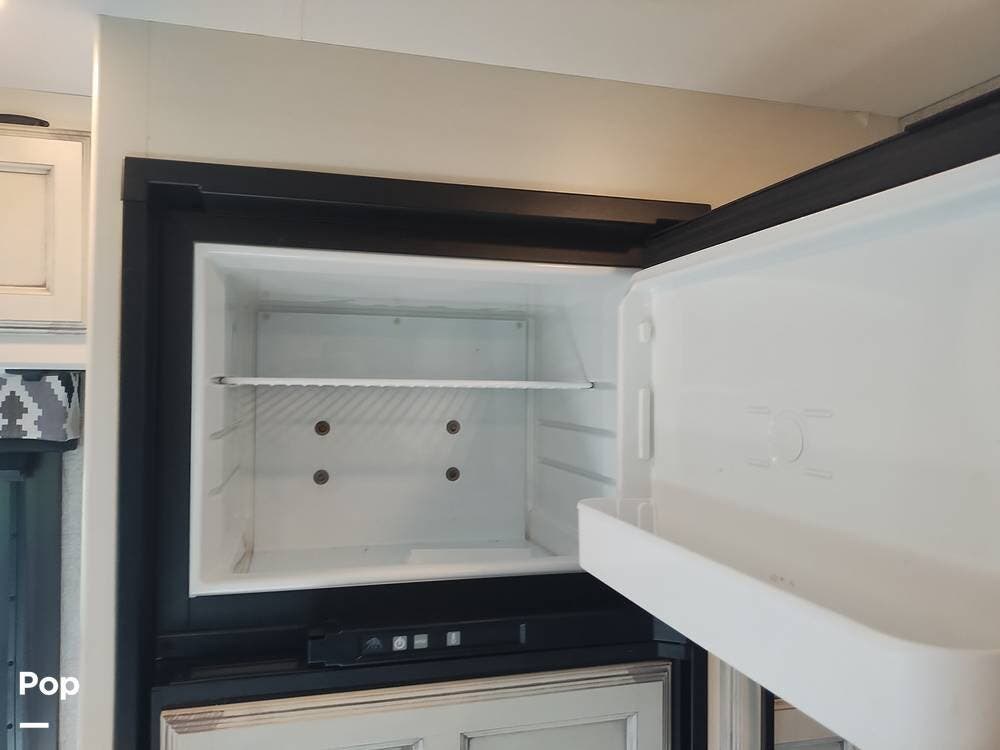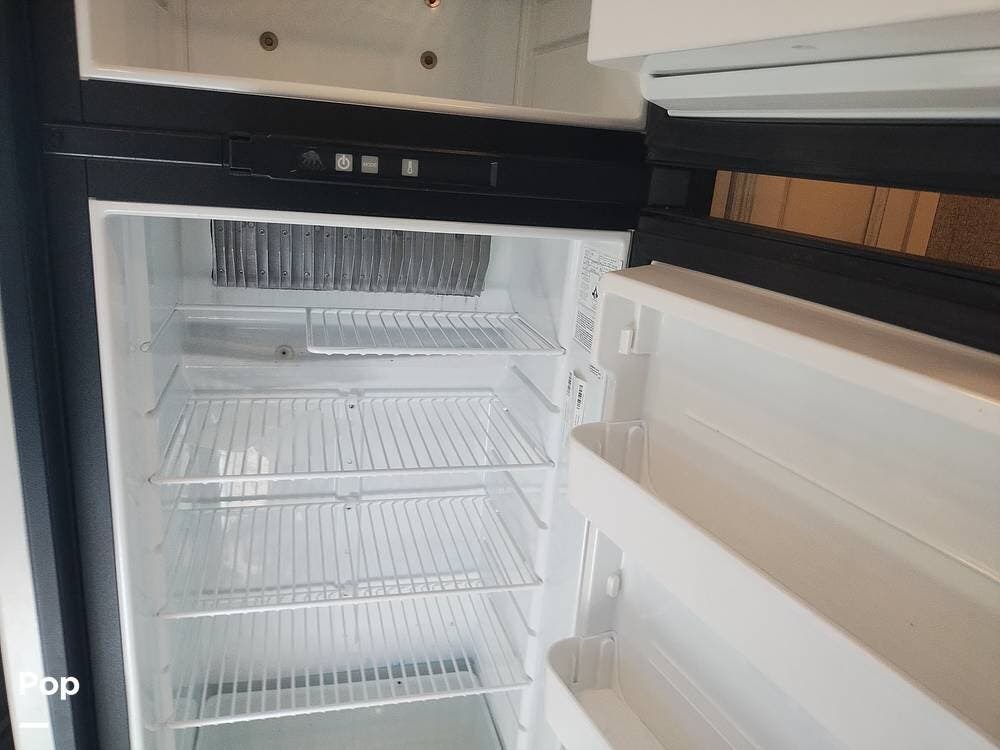 This Redhawk has a mid-coach full kitchen with a cabinet door coordinated mid-size refrigerator and upper freezer, three-burner stovetop, oven, hood fan, microwave, double sink, pull-out pantry, and many cabinets! The solid surface countertops are perfect for meal prep!
