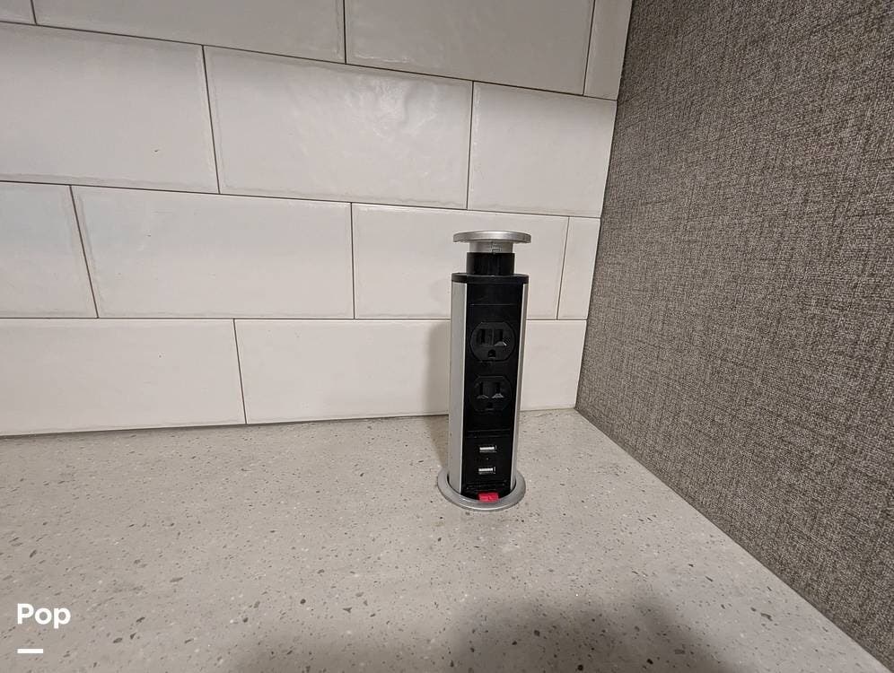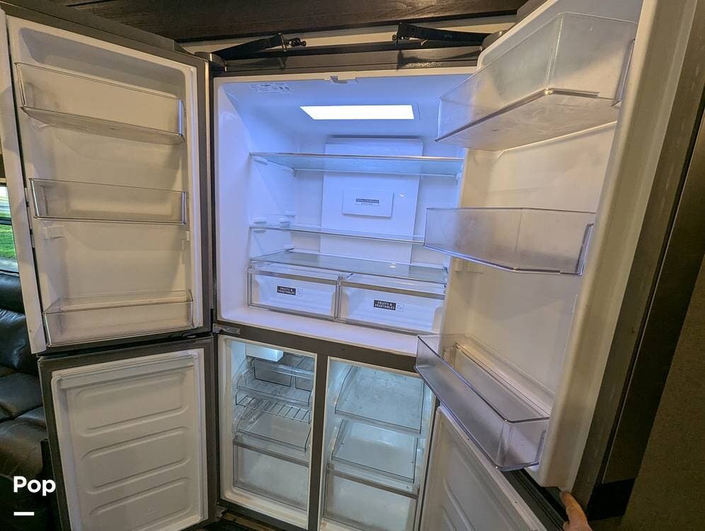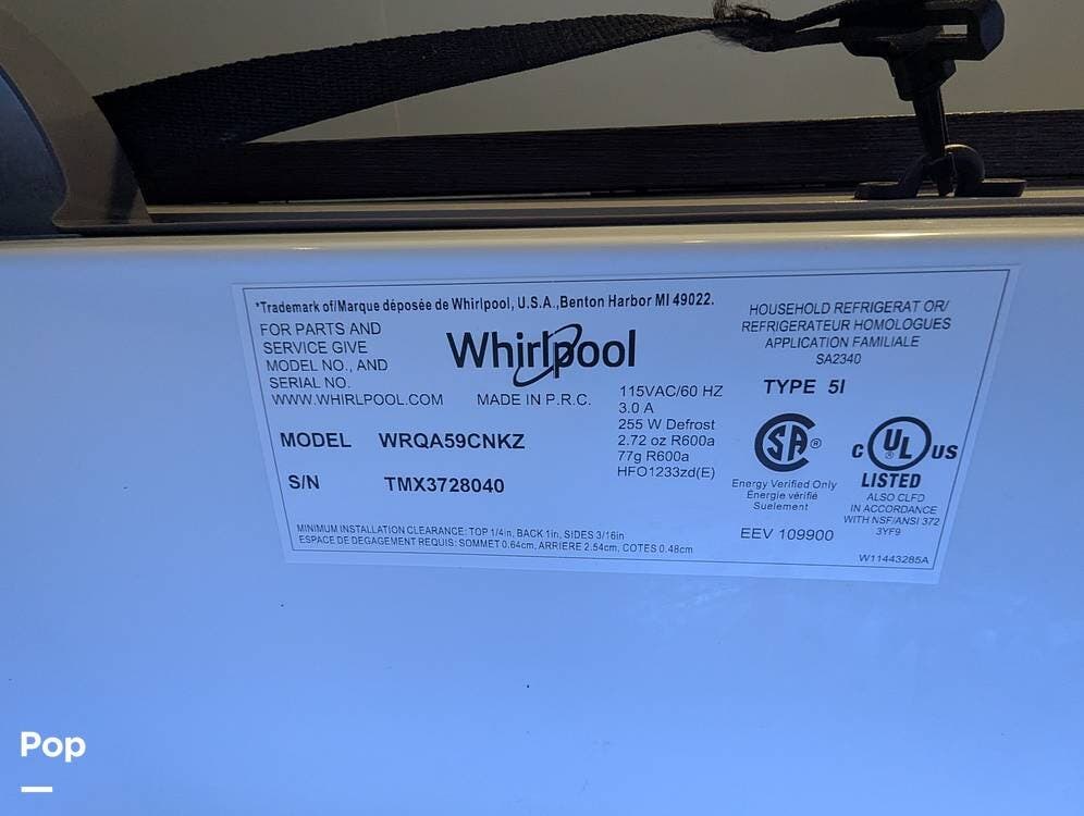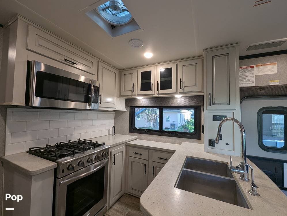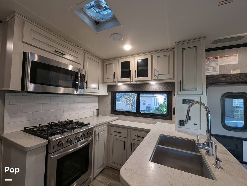 The galley has a family size fridge/freezer, a large sink, The U shaped kitchen includes solid surface countertops, an SST stove with an oven, a convection microwave, and tons of storage.