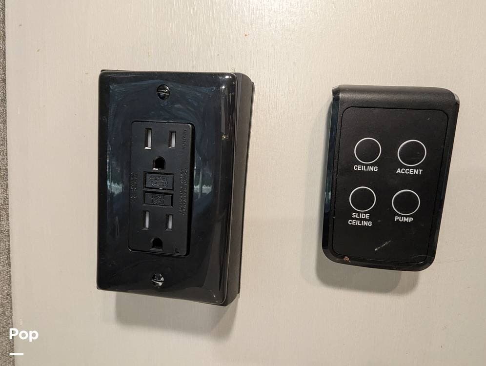 Outside, there are two large electric awnings on the coach's entry side. There's also an outside TV and stereo with speakers and an outside shower.