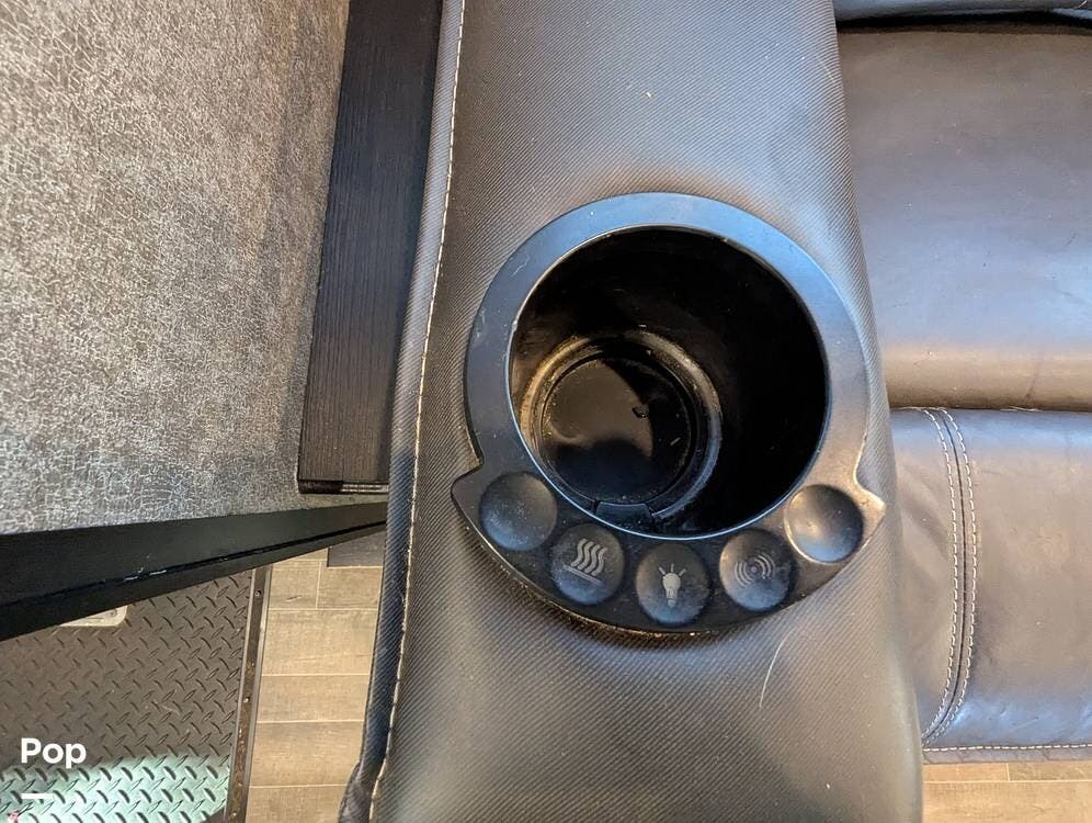 The living area has a sofa with four recliners, two of which have heat and massage. There's also a large flat-screen TV and a fireplace below.