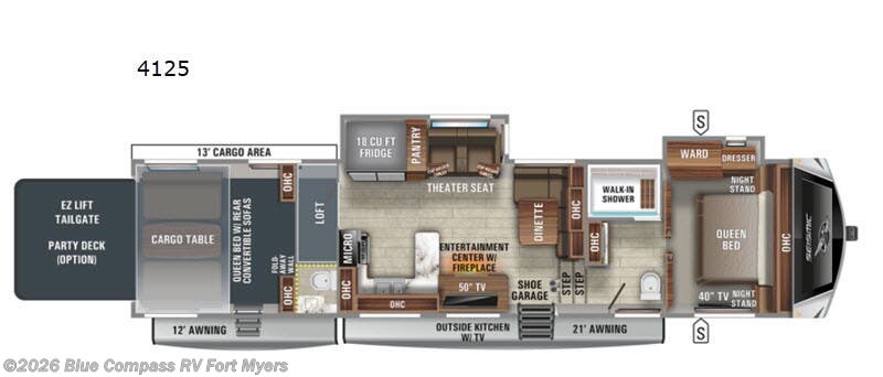An outside kitchen with a TV, a spacious 13' garage, plus a large walk-through bath are just a few features that make this toy hauler great. The EZ lift tailgate will make for easy unloading, and you can dine at the cargo table once your toys are out. The kids are sure to climb up into the loft to play, and you'll find a half bath here with a fold-away wall for convenience. This model features an L-shaped kitchen with ample counter space, plus a pantry for the snacks. Your guests can relax on the theater seat or L-shaped dinette and watch a movie on the 50" retractable TV if it's raining outside, and everyone can freshen up in the full bath that includes a walk-in shower with a seat for comfort. This model also includes a front master bedroom with a walk-around queen bed, a wardrobe slide, plus a 40" TV to watch the news in bed!