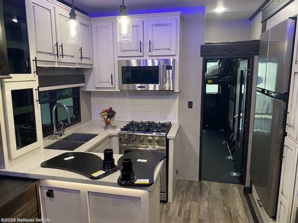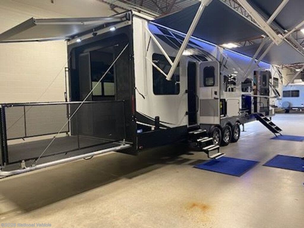 45-foot 8-inch luxury toy hauler fifth wheel featuring a 13-foot separate garage, two slide-outs, and a 3-burner cooktop/oven. It includes a 4-door residential refrigerator, washer/dryer prep, a walk-through bath, and a loft. Built with hydraulic landing gear, it offers an outdoor kitchen, 30,000 BTU A/C, and a 40,000 BTU furnace.