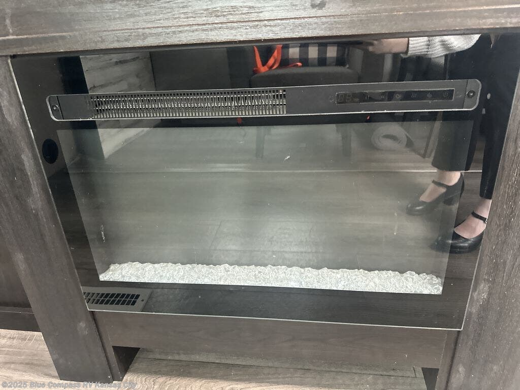 You will feel right at home in this travel trailer! The rear kitchen layout allows you to move about freely while you created a delicious meal with the three burner Furrion glass cooktop, the 8 cu. ft. refrigerator, and even the microwave. You can enjoy each meal comfortably at the booth dinette then play a card game or you can relax on the tri-fold sofa and enjoy the entertainment center with the electric fireplace and the 40" LED TV. You can start your days feeling clean and fresh by taking a hot, steamy shower in the glass 34" radius shower inside the walk-through bathroom, plus there is a linen closet and a small wardrobe for your storage needs. The front private bedroom offers a queen bed for a good night's rest with wardrobes on either side to keep your clothes neat, and even an entrance/exit door for you to slip out early in the morning for a quick fishing trip!