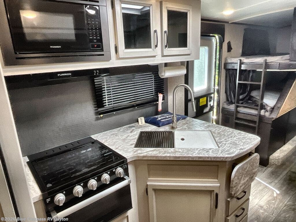 There is something for everyone in this travel trailer! From the double-over-double bunks with a 600 lb. weight rating per bunk with storage below the bottom bunk to the outside kitchen and dual entry doors. The rear corner bathroom is spacious with a glass 34" radius shower that has a skylight above for natural lighting as you get ready and a linen closet to keep your linens close by. You will feel right at home in the front private bedroom with a queen bed that has plenty of walk-around space and a walk-in closet to keep your clothes looking their best. Grab a drink from the 8 cu. ft. refrigerator, fry some bacon on the three burner Furrion glass cooktop, and then head outside and relax underneath the 21' electric awning!
