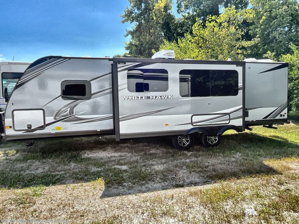If you're wanting a lightweight travel trailer packed with convenience and luxury then look no further than these Jayco White Hawk travel trailers! Jayco uses the top-quality materials and innovative manufacturing techniques to create the superior StrongholdVBL vacuum-bond lamination, and the Magnum Truss Roof System for a 50% stronger roof than any other in the industry. The screwed construction creates a more firmly secured structure and the 2" x 2" vertical studs provide smoother edges for safer wiring to reduce the risk of electrical shorts. Each model comes with two mandatory packages to include extra luxurious features like the Furrion range, the kitchen skylight, and the outside shower. You will also enjoy the Climate Shield zero-degree tested weather protection, the JAYCOMMAND "Smart RV" system, and the MORryde StepAbove entry steps, plus there is even a roof-mount solar prep. The American-made Goodyear tires and Dexter axles with self adjusting brakes and galvanized steel wheel wells ensure you will arrive safely to each destination. Come explore these lightweight travel trailers today!
