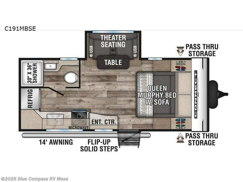 You and your spouse will love this easy-to-tow-and-set-up Connect SE travel trailer with theater seating for two including USB ports to keep the devices charged and a table to dine at, and all is within a slide out giving you more floor space for your friends to relax on the sofa which is below the queen Murphy bed. And you can easily set up the bed at nighttime. The full bathroom will keep you refreshed for whatever is next on the agenda be it walking, hiking or relaxing under the 14' power awning. And the kitchen gives you all the amenities to make warm meals and store dry goods in the overhead cabinets and cold food in the refrigerator.