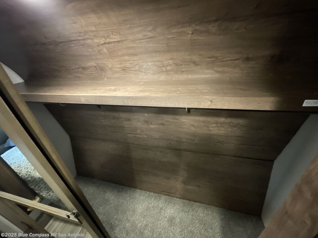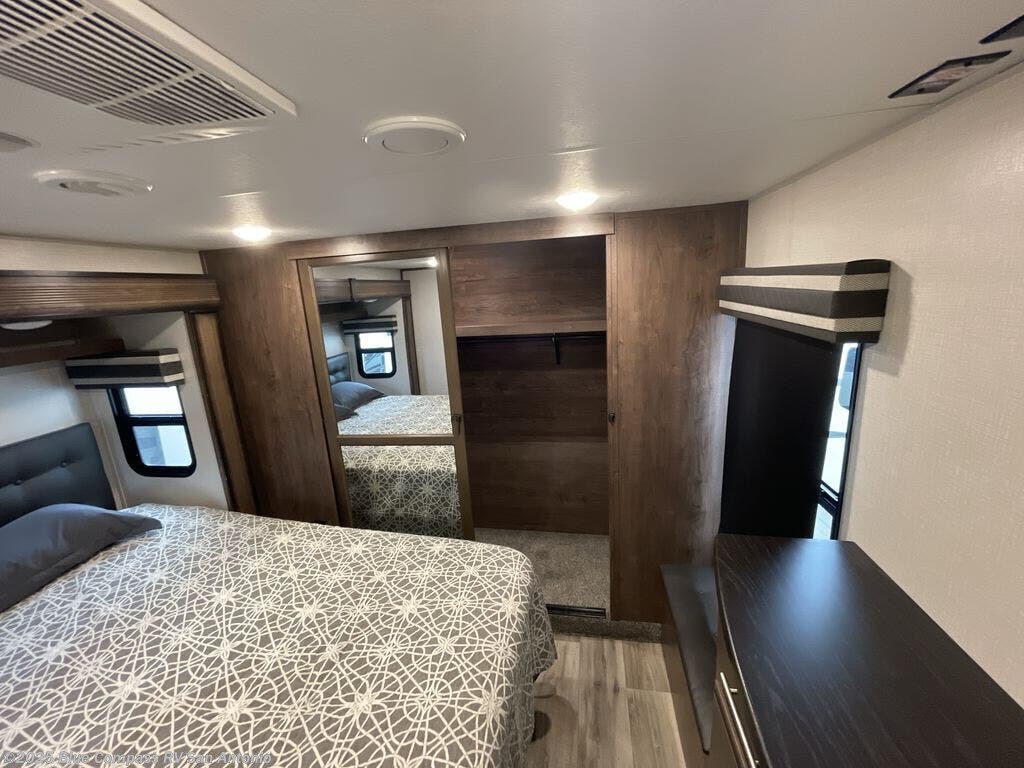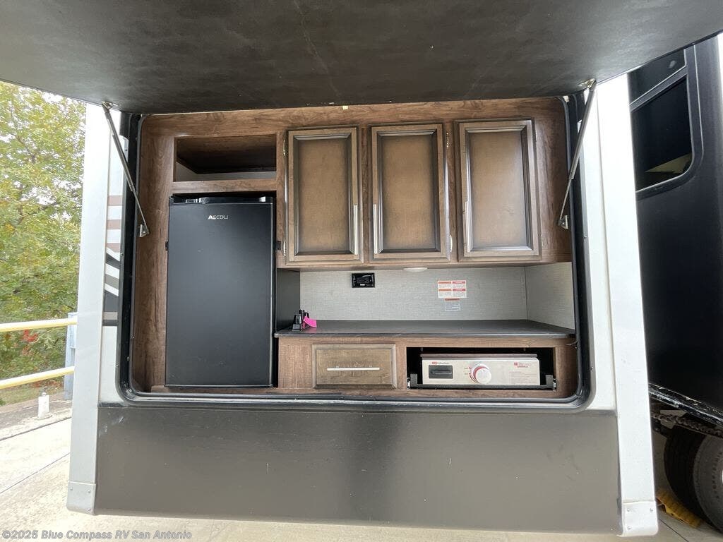 The kids or your guests will love having their own space in the private bunkhouse! They can enjoy a hide-a-bed sofa with a bunk above and two bunks on the opposite side, plenty of storage and an entertainment center, lots of floor space thanks to the dual opposing slides, and a half bath which is quiet handy at night. You will have your own king bed slide in the front bedroom on the opposite side of the RV. If you like to keep everything clean while camping, choose the washer and dryer option in the prepped space in the wardrobe, and the handy built-in hamper in the dresser is near by. The cook will have a full kitchen to make meals including a 12 cu. ft. refrigerator, and the choice to cook outdoors on the outside kitchen. You will also be able to tow with the hitch receiver, walk up the flip-up solid steps with ease, and sit under the 16' power awning when you would like some outdoor living space.