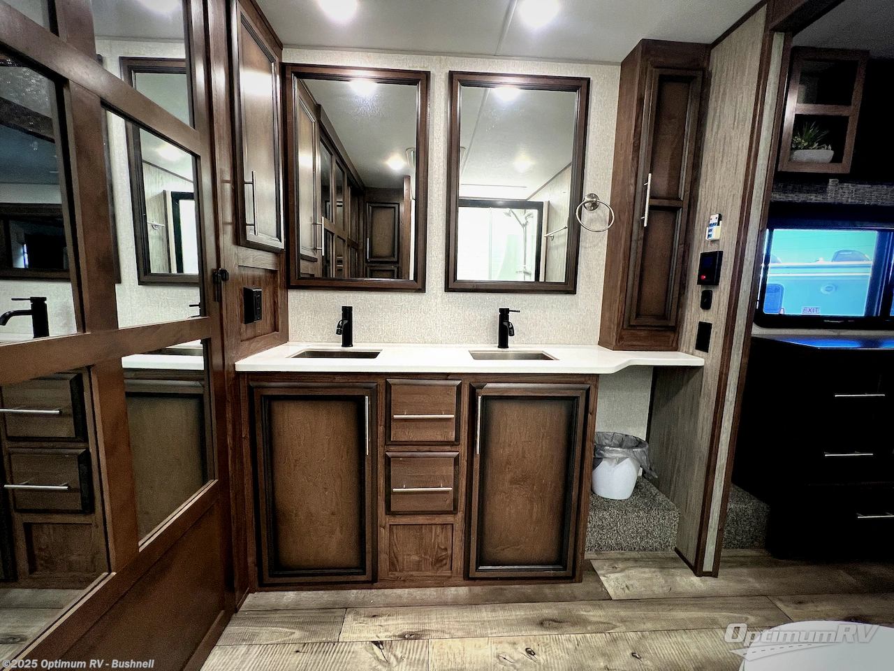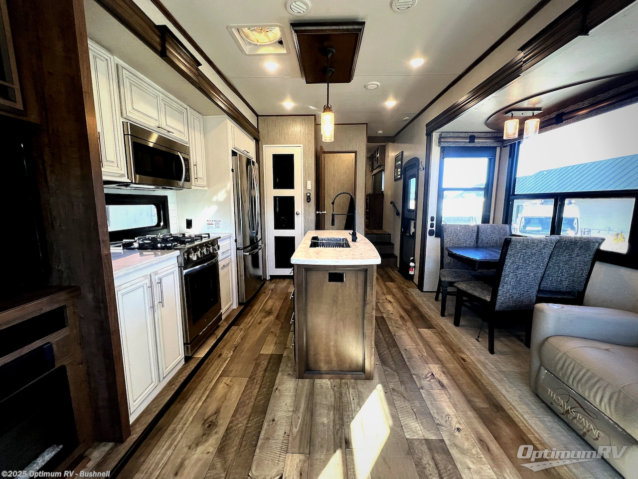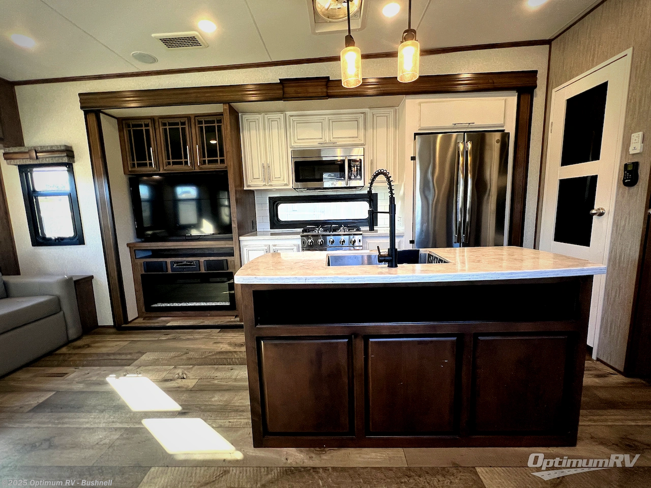This couples fifth wheel gives you two sinks in the front spacious bathroom that also includes a wardrobe, linen storage, a washer/dryer prepped space, plus a residential shower with a seat. Sleep like a king on the electric-tilt bed that makes watching a show on the 32" LED TV comfortable and provides storage underneath with three drawers. You can relax during the day on the theater seating while watching a show on the 50" LED TV, and the fireplace at night will create a cozy atmosphere. Let the chef prepare dinner on the four-burner range or in the convection microwave and the kitchen island will provide extra counter space. And there is even a stainless steel dishwasher to make clean-up a breeze. This model features a hide-a-bed sofa your guest or the grandkids can sleep on at night and the half bath will be all theirs.