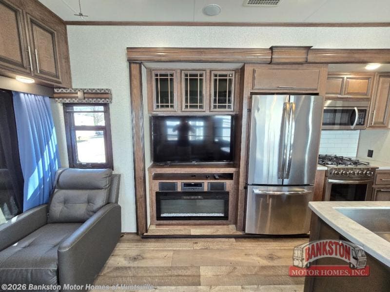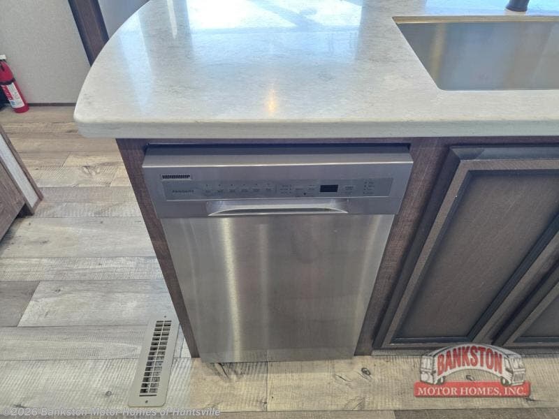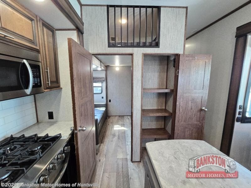 You will enjoy living or camping in this fifth wheel with the choice to hangout outside above ground on the rear patio deck with a patio door for easy access plus you can use some of the space to store your outdoor gear like fishing pools, wet boots, and such. The 19' power awning by the main entry also offers an outdoor living area protected from the elements and you might choose to add a second awning option. The cook will enjoy making food for everyone with all the appliances and floor space plus the stainless steel dishwasher will help with clean up. The extra room is accessed through the kitchen and can be utilized as an office with the desk top, a second living area and/or a second bedroom thanks to the hide-a-bed sofa. The queen-size loft above has stairs with access in the hallway so the kids can easily get to the loft to sleep or play, and it is near the full bathroom. The front master bedroom will surely not disappoint each time you enter thanks to electric-tilt king bed and all the storage for your clothing, plus there is a space prepped for a washer/dryer option and more handy storage.