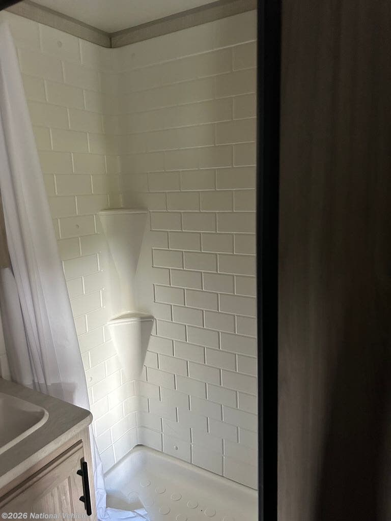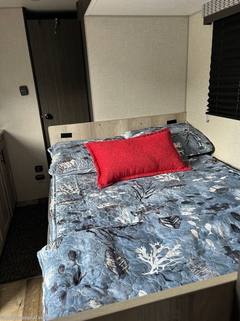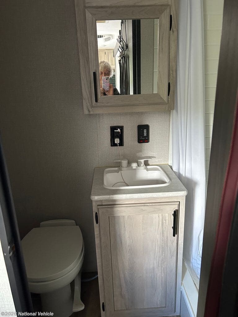 The front queen bed offers a cozy place to relax, while the dinette converts for additional sleeping, accommodating up to four. In the rear, a spacious full bathroom provides a large shower and extra room rarely found in a camper this size.