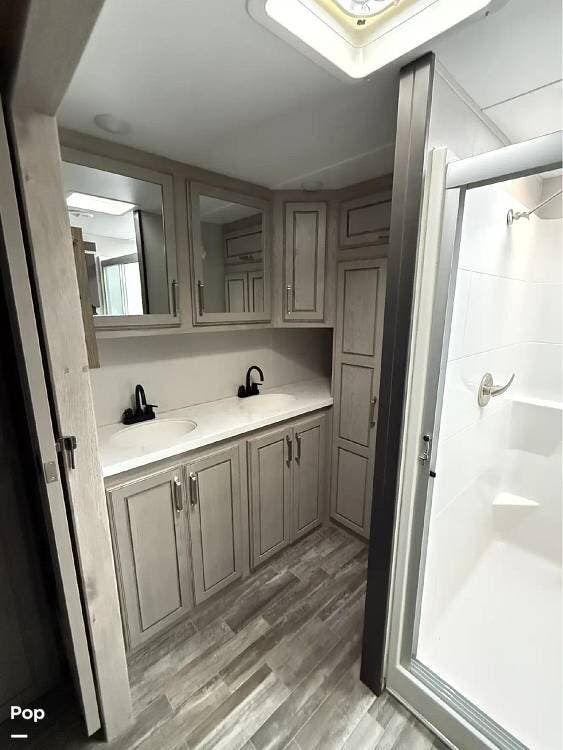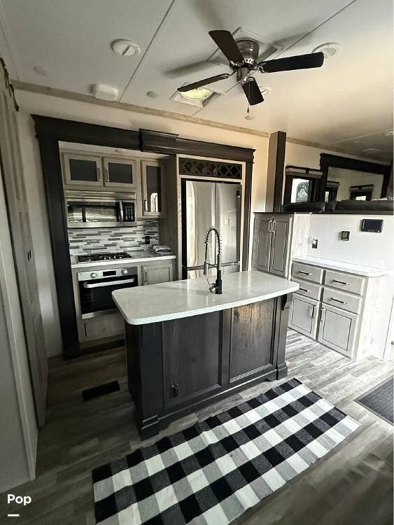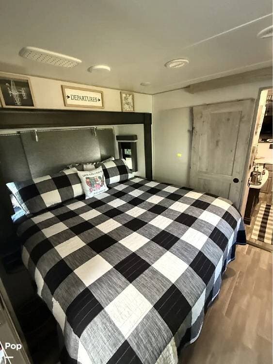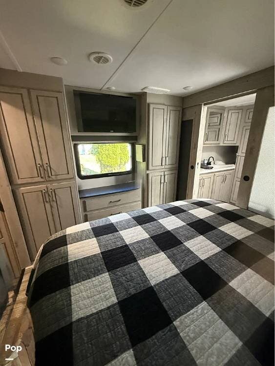 The rear bedroom offers a true retreat with a king bed and washer/dryer prep, providing comfort and practicality for longer stays. The bathroom is designed for residential comfort and includes an on-demand water heater for continuous hot water.