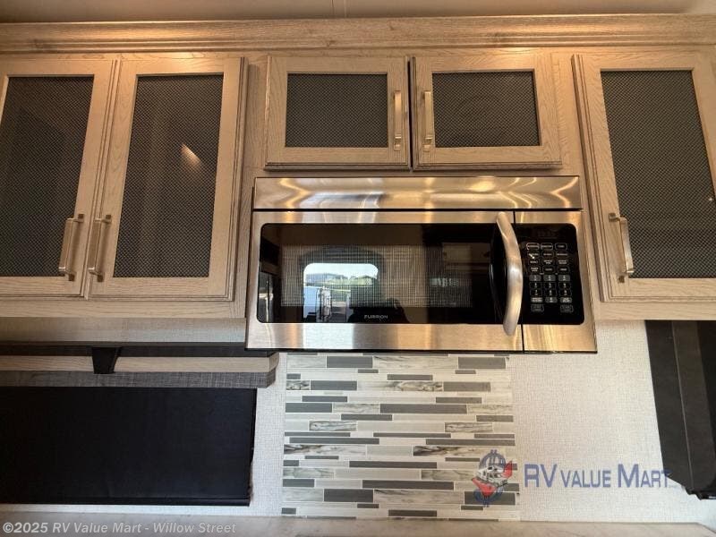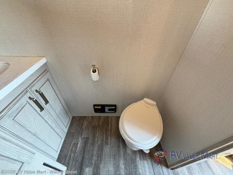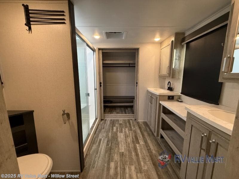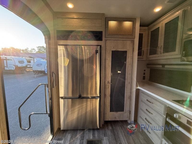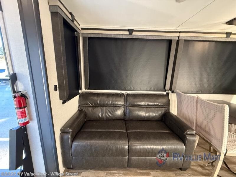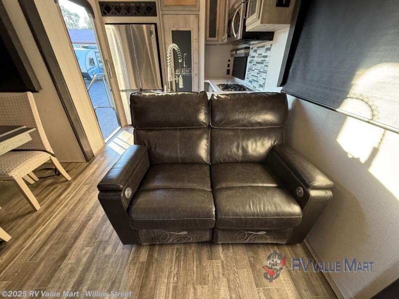 This is the perfect couples RV that has a chef in the family! The rear kitchen offers everything from an 18 cu. ft. gas/electric refrigerator or choose the residential option, a large pantry, and lots of counter space with full amenities to make a thanksgiving meal. The second exterior entry in the kitchen allows you to take food outside to enjoy under one of the two electric awnings without having to walk very far. The chef will even have good sightlines into the separate living area to watch the 50" LED TV and visit with any guests sitting on the tri-fold sofa sleeper slides or the theater seats. You can also dine inside at the free standing dinette. The half bath is conveniently located near the main entry and includes a space prepped for a washer/dryer option, and your front full bathroom is complete with dual sinks and a walk-in wardrobe. And don't forget about sleeping like a king in the master suite!