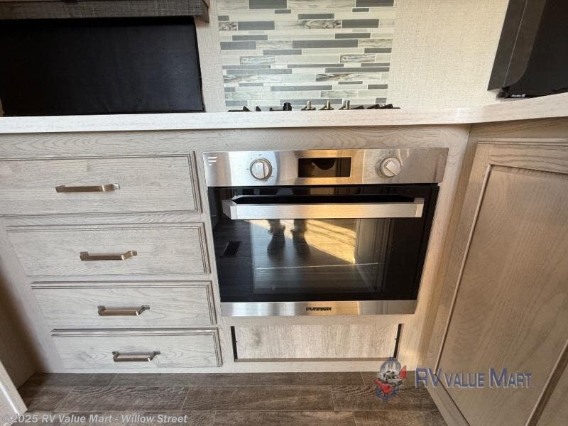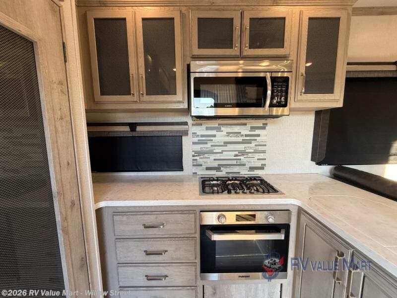When you choose an Alpine fifth wheel by Keystone RV, you are choosing luxury, innovation, modern style and so much more! The stunning Aspen Oak cabinetry with contrasting Renewed Oak accents and vintage wire mesh glass inserts, the polished natural stone solid surface countertops, and the varied plank width resilient flooring throughout are just a few highlights inside. Some other noteworthy features include the high-fidelity video and audio to withstand road vibration with three, separately controlled sound zones with smartphone app capability, and the iN-Command system with oversized touchscreen monitor giving you control of the slides, awnings, and HVAC. Each Alpine is built with 100" wide body construction, a dual 15,000 BTU Whisper Quiet A/C system, a Nautilus On-Demand water heater for instant, endless hot water, and insulated wrapped tanks with 12 volt heat pads allowing you to travel every season.