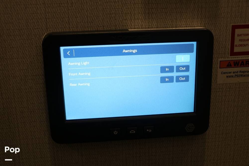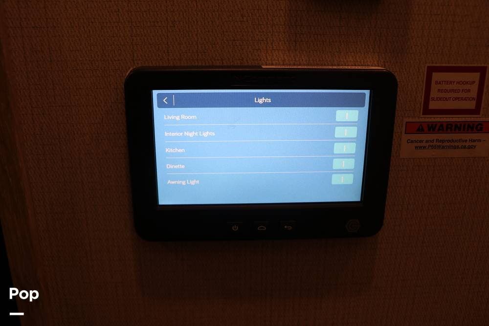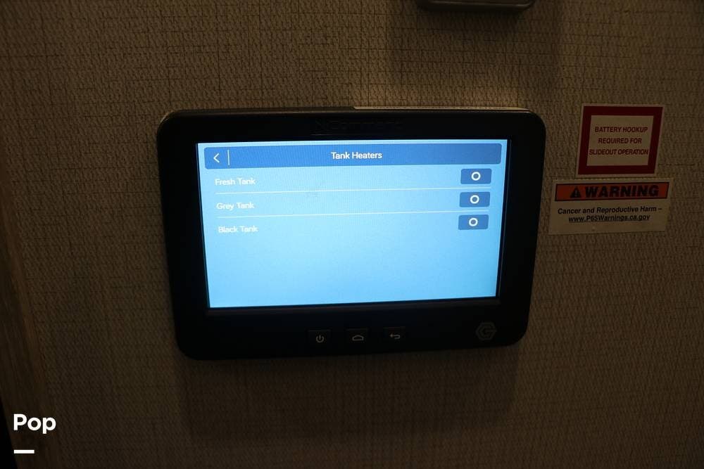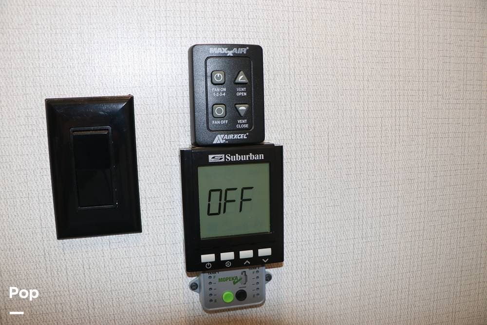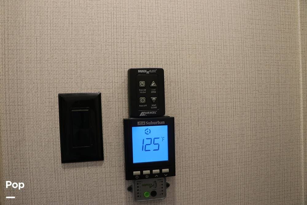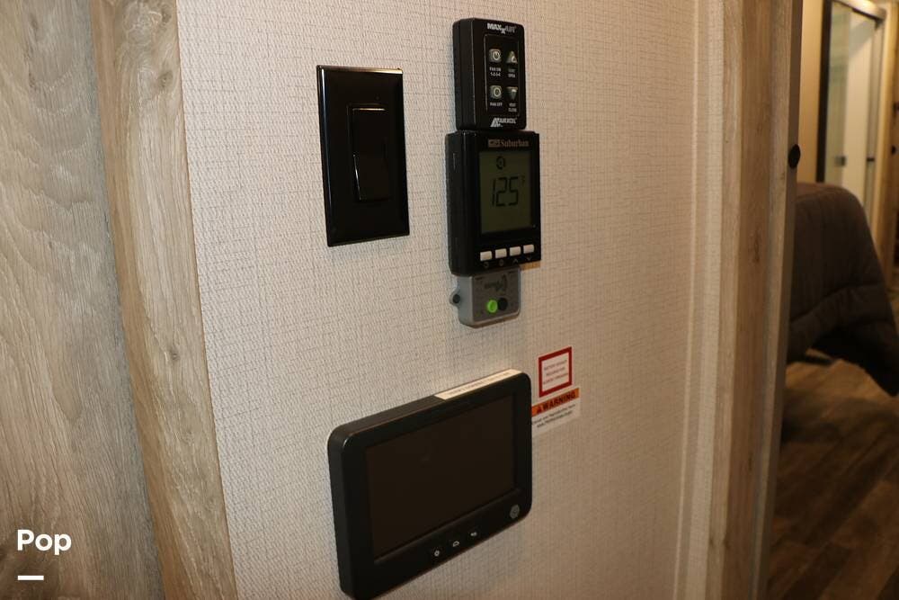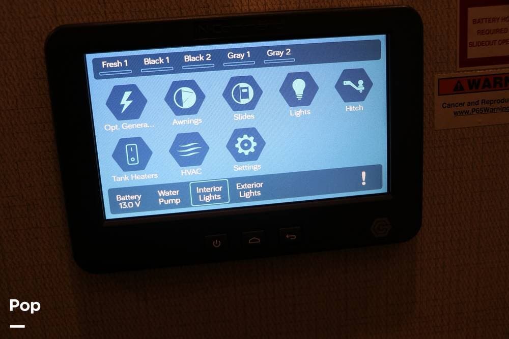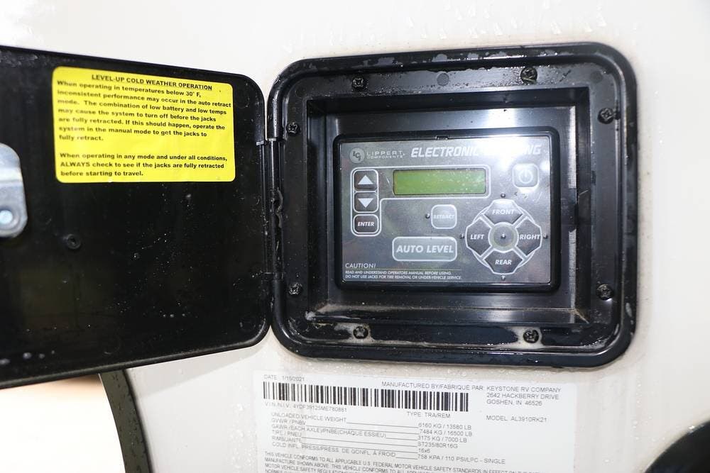Just up the steps in the hallway is the touch-screen control panel, which allows you to control all aspects of the RV--lighting, heating/cooling, slides, awnings, leveling system, and more. The unit is equipped with a tankless water heater, and the control panel is next to the controls for the MAX AIR Fans and the LPG Tank Level indicator. All of the controls are in one central location.