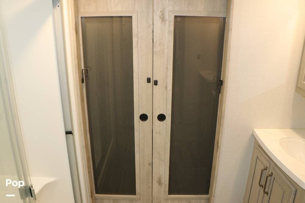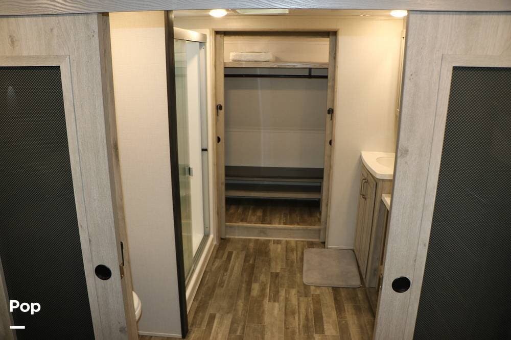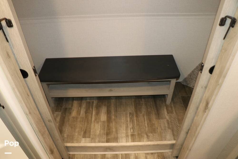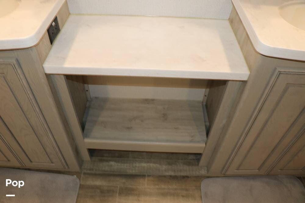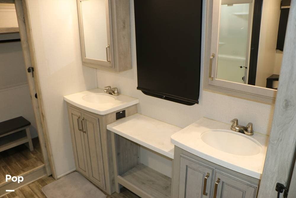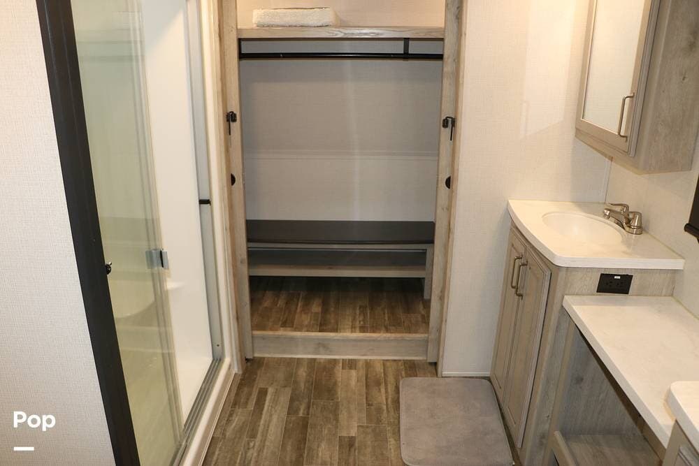 The master bathroom is large and inviting. It features a step-in shower with a skylight overhead for lots of natural lighting and a built-in corner seat. The double vanities are especially lovely and make this RV feel much like a home on the road. The toilet is next to the shower, and the large wardrobe closet with bench seating is just another very nice feature you will enjoy.