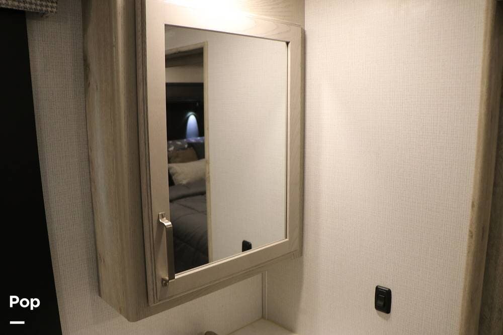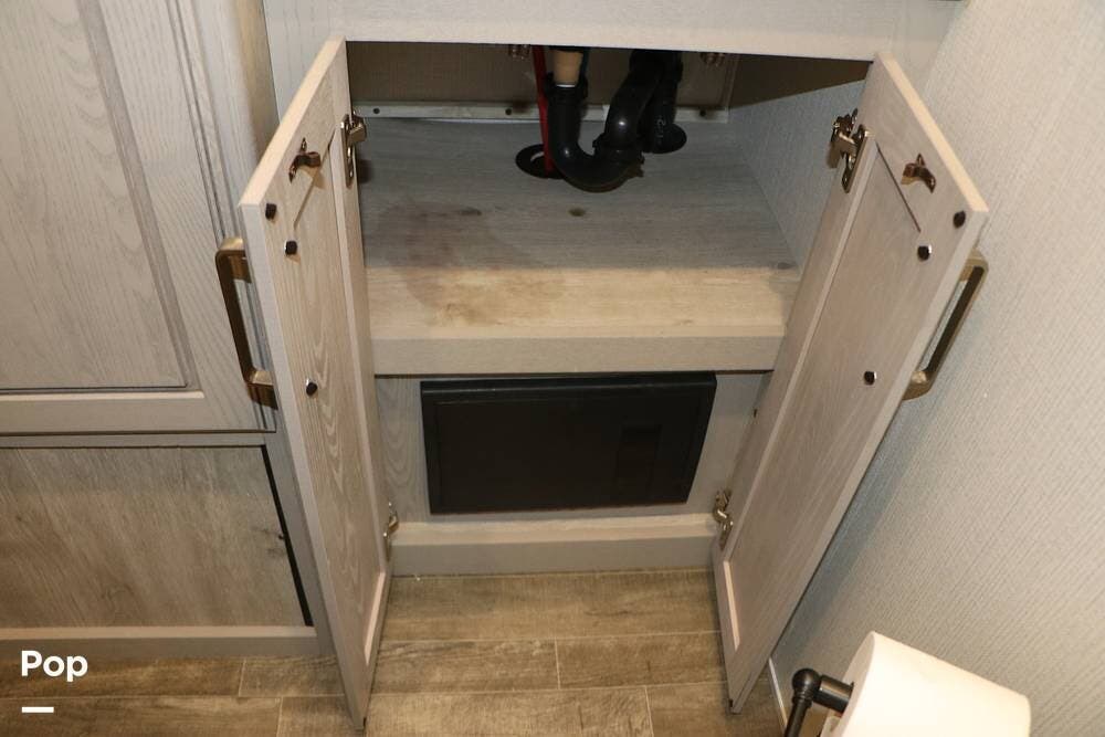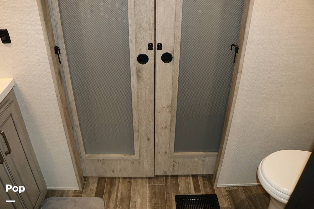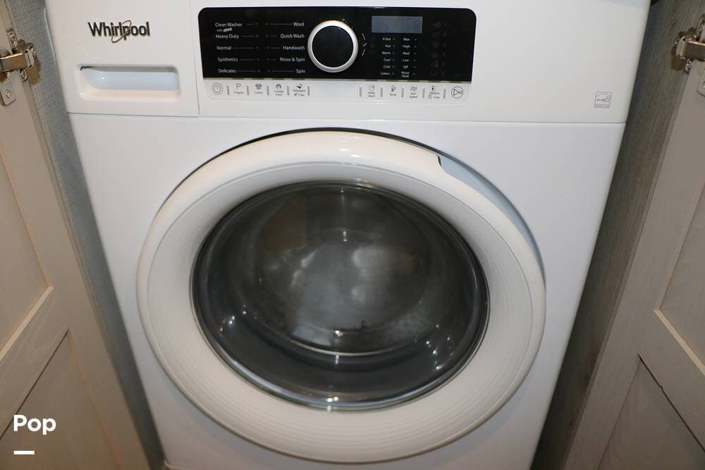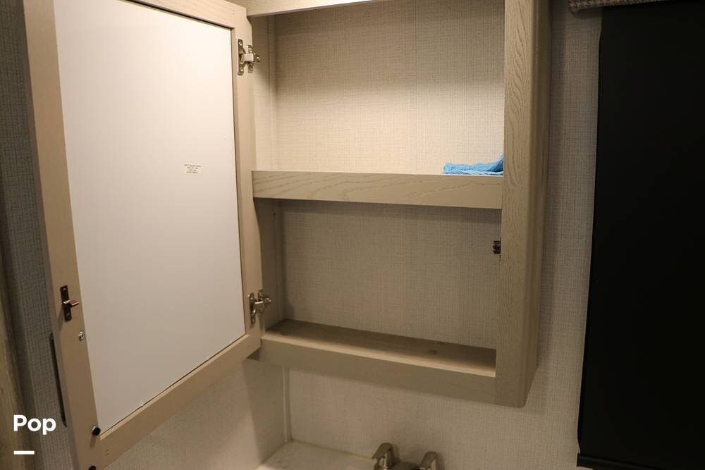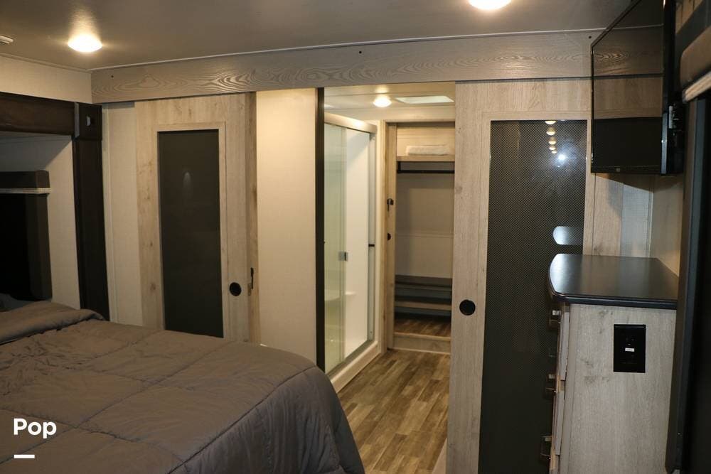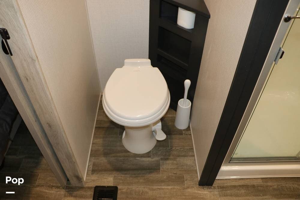 The master bathroom is large and inviting. It features a step-in shower with a skylight overhead for lots of natural lighting and a built-in corner seat. The double vanities are especially lovely and make this RV feel much like a home on the road. The toilet is next to the shower, and the large wardrobe closet with bench seating is just another very nice feature you will enjoy.