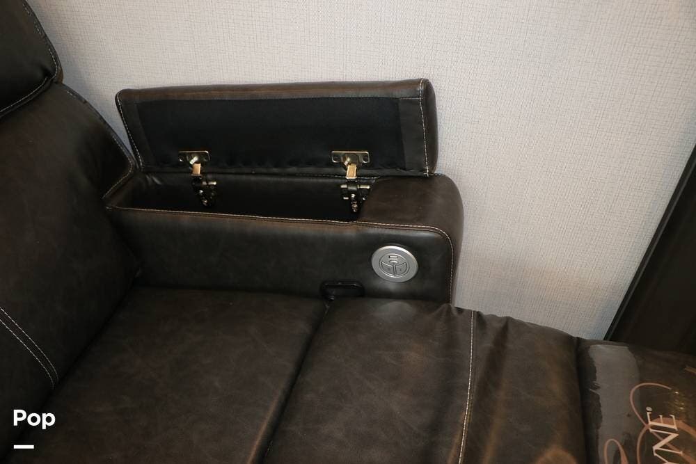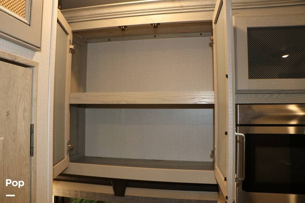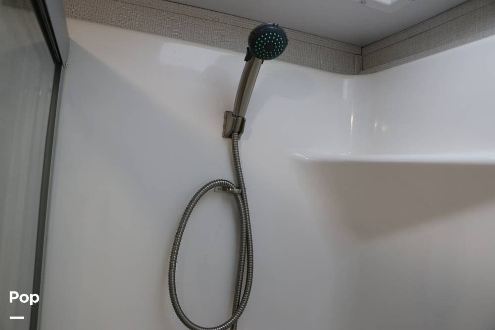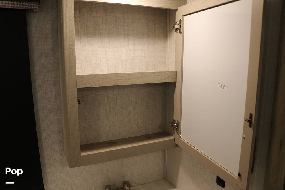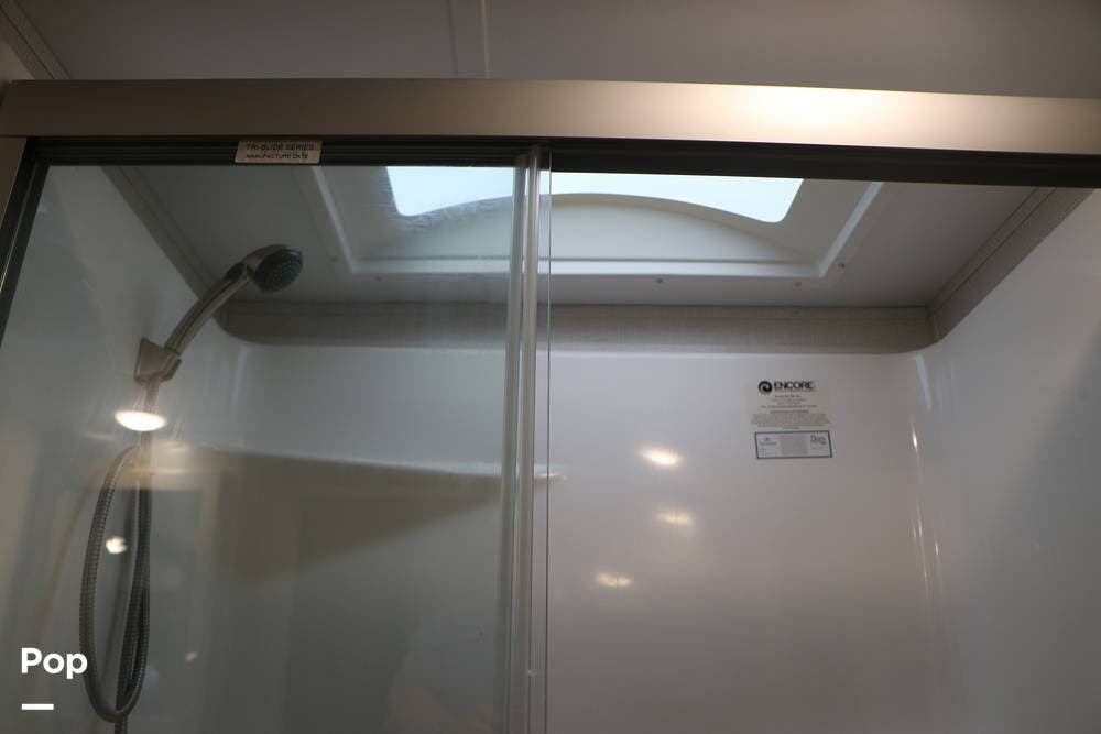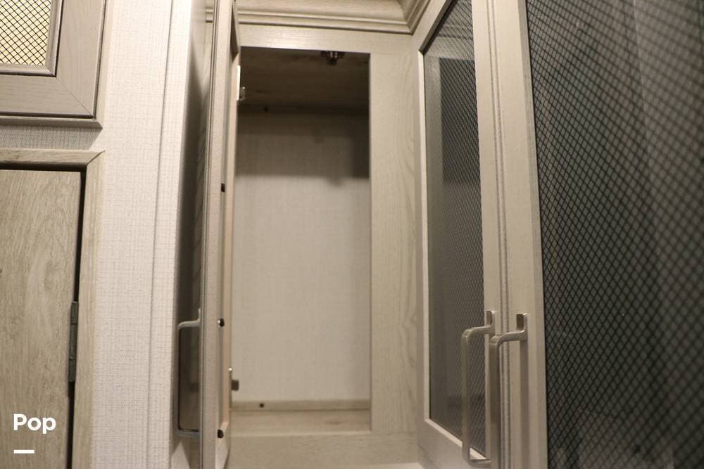 The master bathroom is large and inviting. It features a step-in shower with a skylight overhead for lots of natural lighting and a built-in corner seat. The double vanities are especially lovely and make this RV feel much like a home on the road. The toilet is next to the shower, and the large wardrobe closet with bench seating is just another very nice feature you will enjoy.