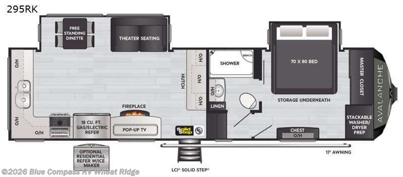 With any Keystone luxury full-profile Avalanche fifth wheel, you can experience wide-body construction that allows you to stretch out and stay awhile during any season thanks to the Polar Pack All Season Protection that includes a heated and enclosed underbelly, an Astro foil reflective layer on the roof, front and rear walls, and two static attic vents, plus more! The interior offers grained soft gray wood throughout and polished natural stone solid surface countertops, plus your choice of modern interior design. There are many more Keystone exclusives, plus standard and optional features that will allow you to choose the perfect RV for you!