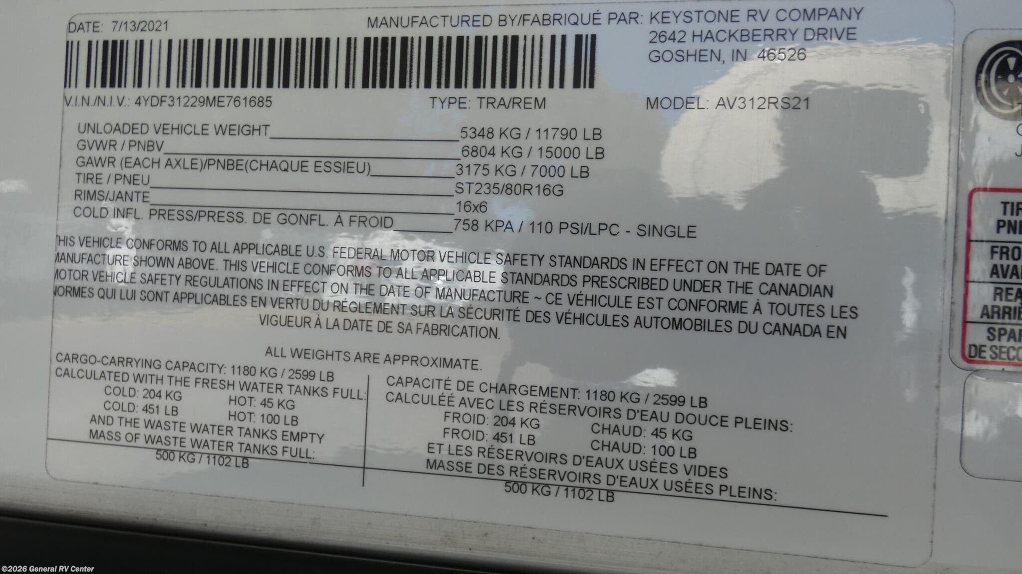 Request More Info on this 2021 Keystone Avalanche 312RS Offered for sale by General RV Center