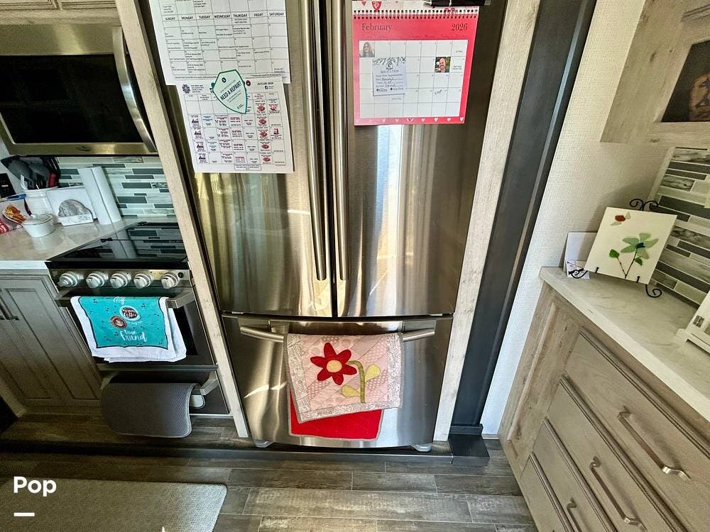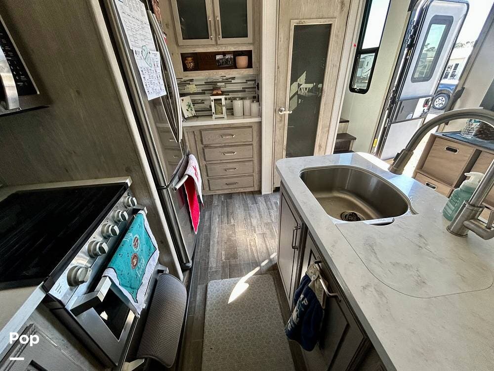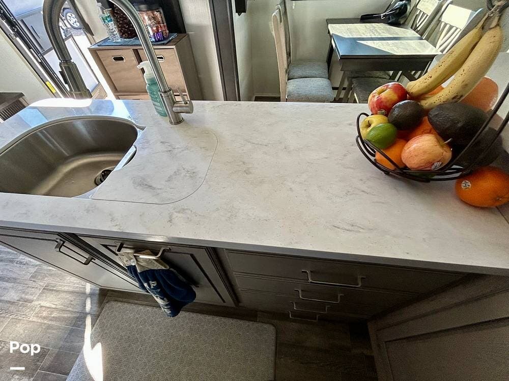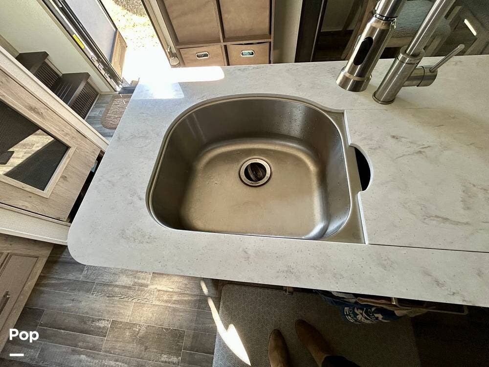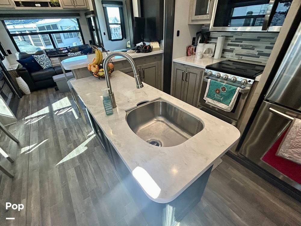 On the exterior, features like Road Armor suspension, Max Turn technology, and Hitch Vision simplify towing and improve handling. The outdoor kitchen and pass-through storage are added bonus features for your convenience and enjoyment!