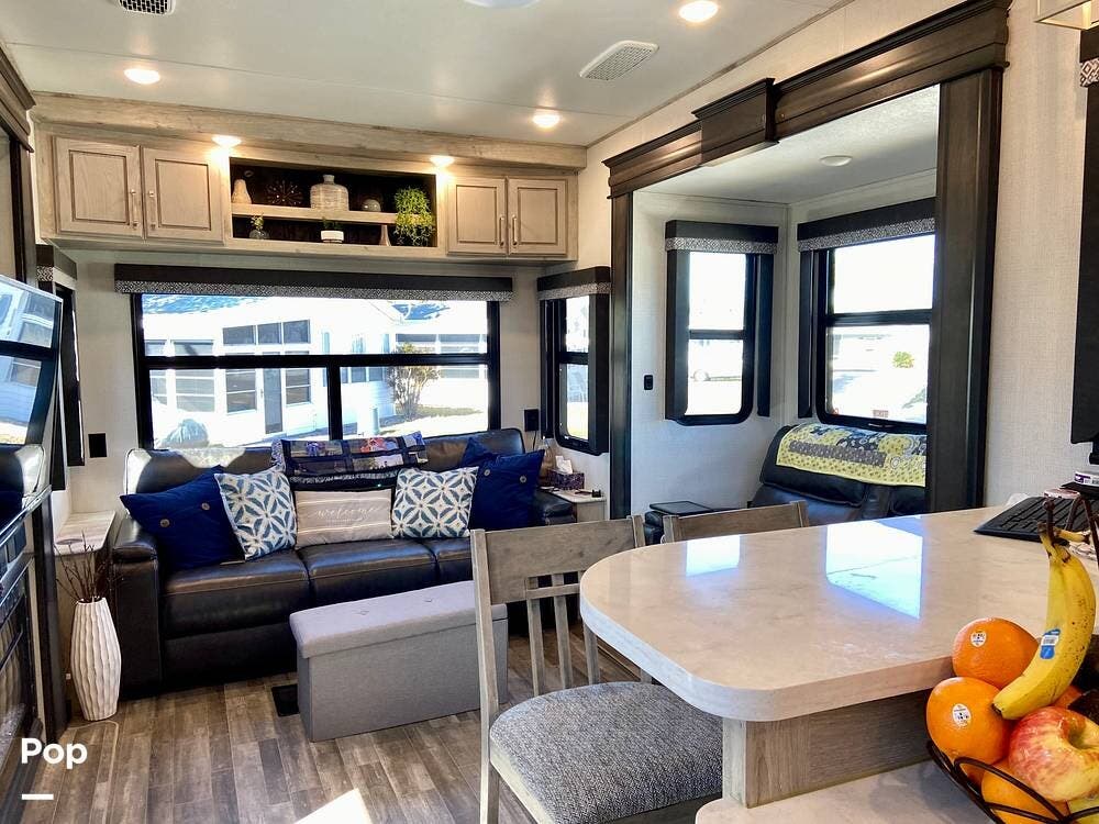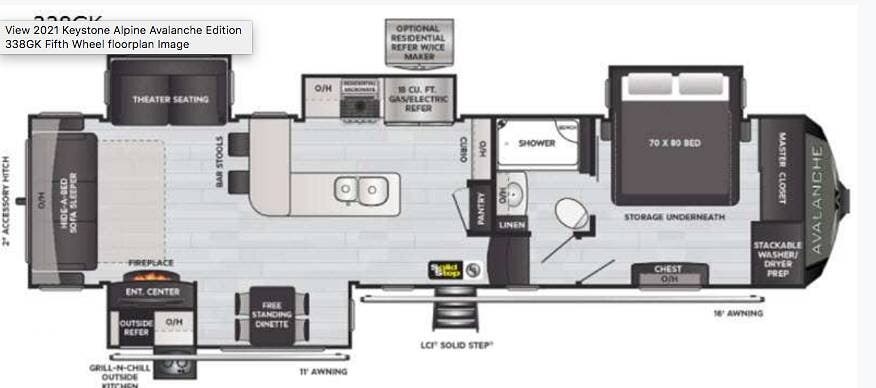 The 2021 Keystone Avalanche 338GK is a luxury full-profile fifth-wheel RV built for comfortable, extended travel.