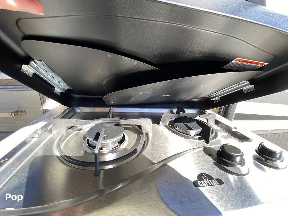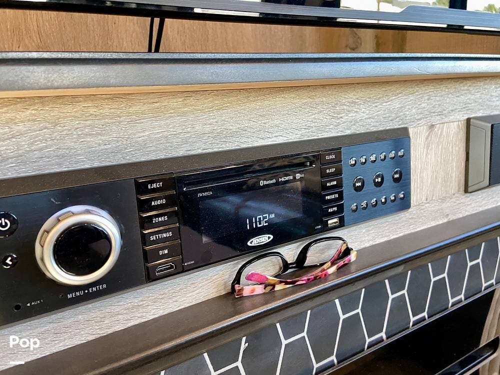 The interior is designed for convenience and comfort, featuring well-appointed cabinetry, solid-surface countertops, and ample storage.