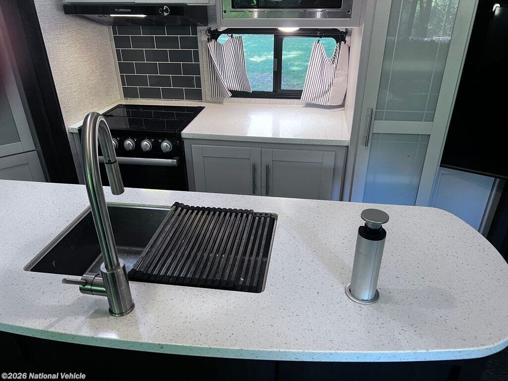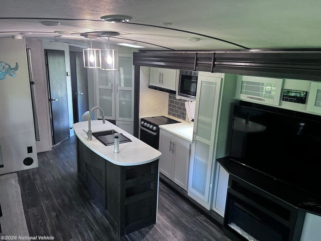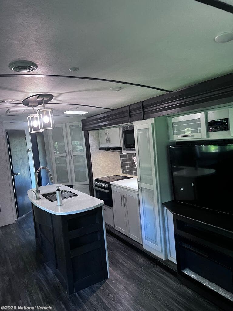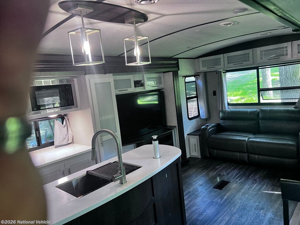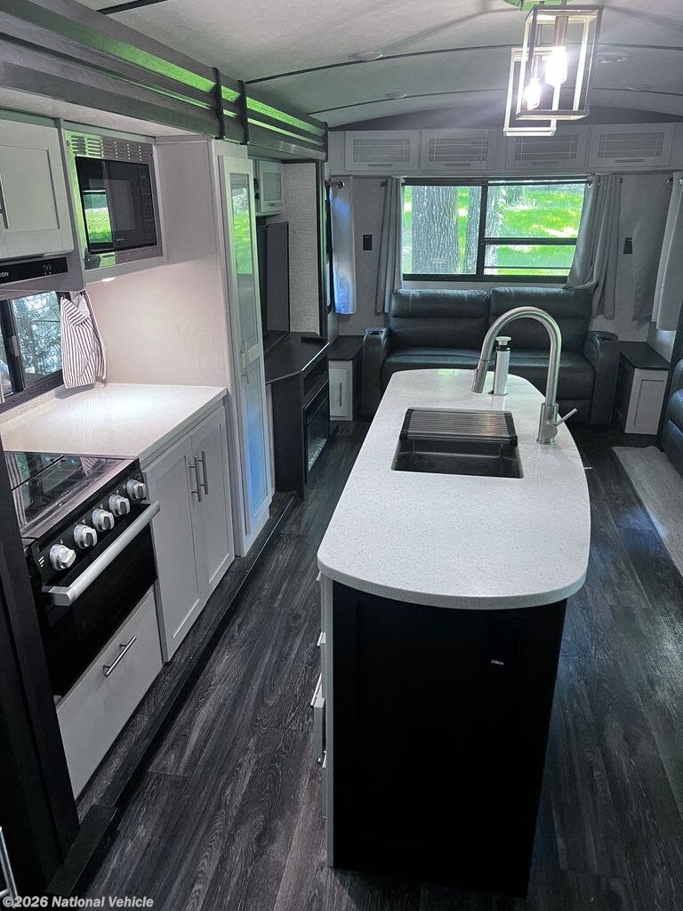 The kitchen is designed with both style and function in mind, featuring solid-surface countertops, a center island for added prep space, a 3-burner range with oven, microwave, refrigerator, and abundant cabinetry. Whether you?re cooking for two or hosting guests, this kitchen provides everything you need for life on the road.