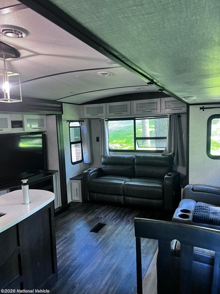 Step inside and you?ll immediately notice the open rear living floorplan, highlighted by opposing slide-outs that create a wide, inviting living space. Relax on the sofa or lounge in the theater seating while enjoying the entertainment center, or gather around the free-standing dinette for meals, work, or entertaining. Large windows throughout the rear living area provide plenty of natural light and scenic views, giving the space a bright, comfortable feel.