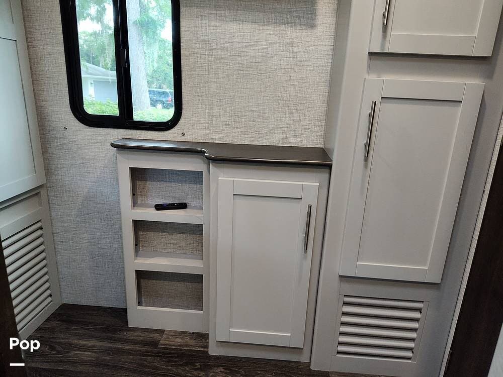 The LED lighting is a great feature and makes the trailer's exterior look futuristic. The full body paint on the exterior is a very nice feature of this unit. The Bullet has electric levelers and an electric lift hitch. The exterior has lots of storage space, an awning over the front entry, and two separate entry doors to the trailer.