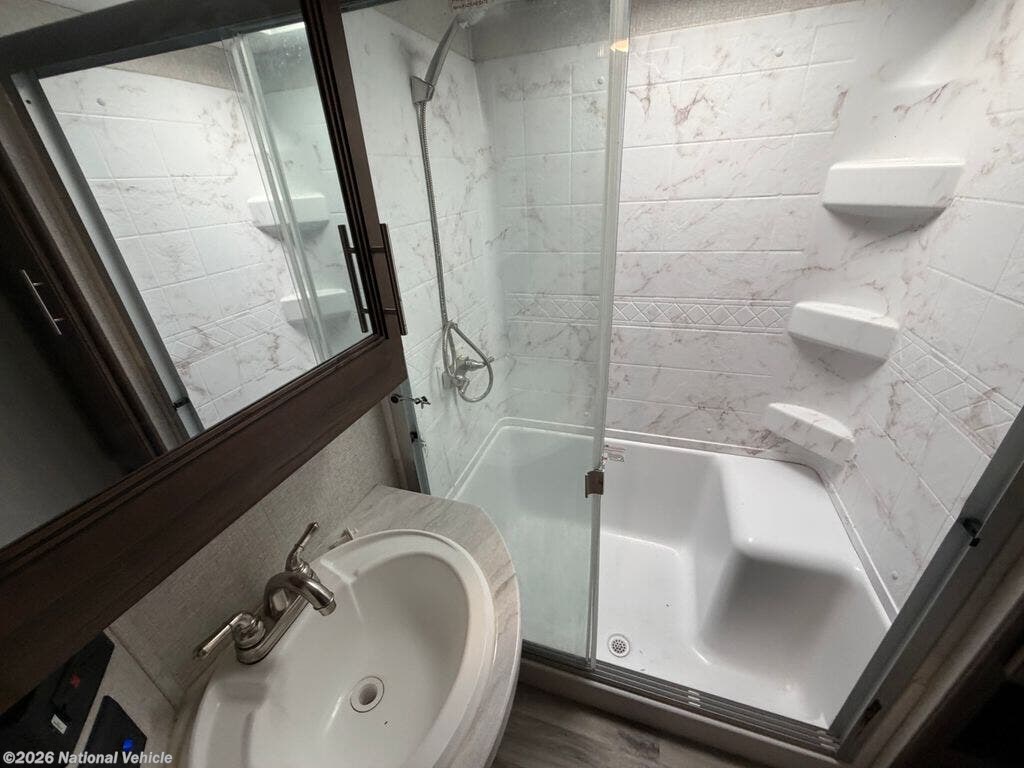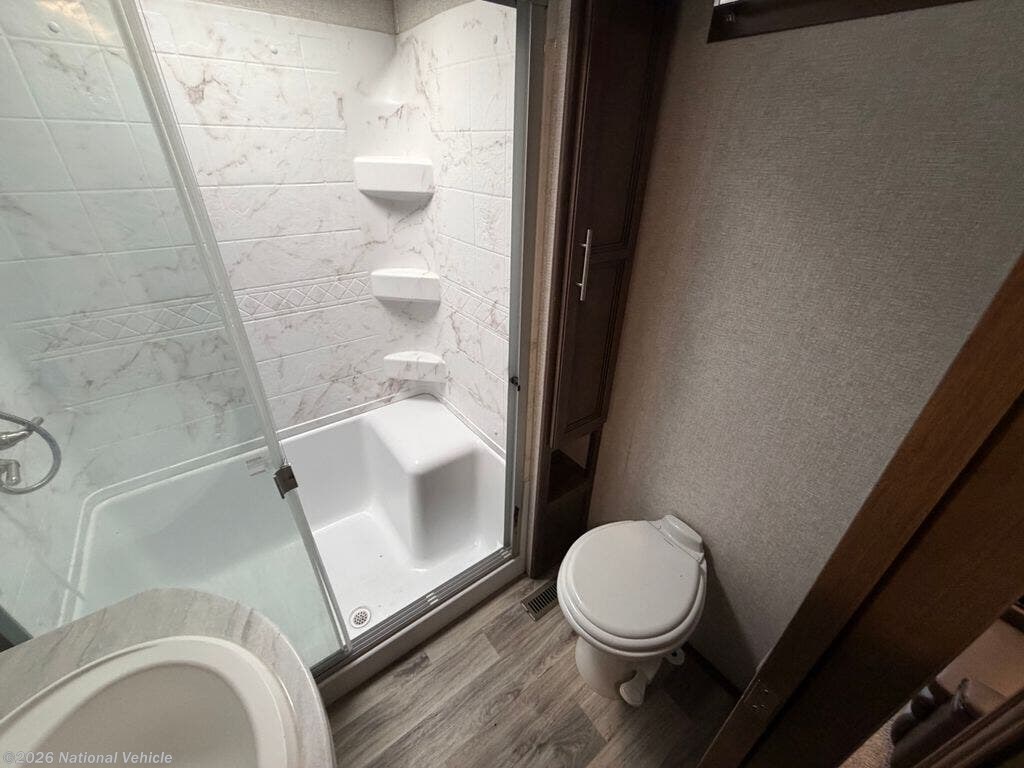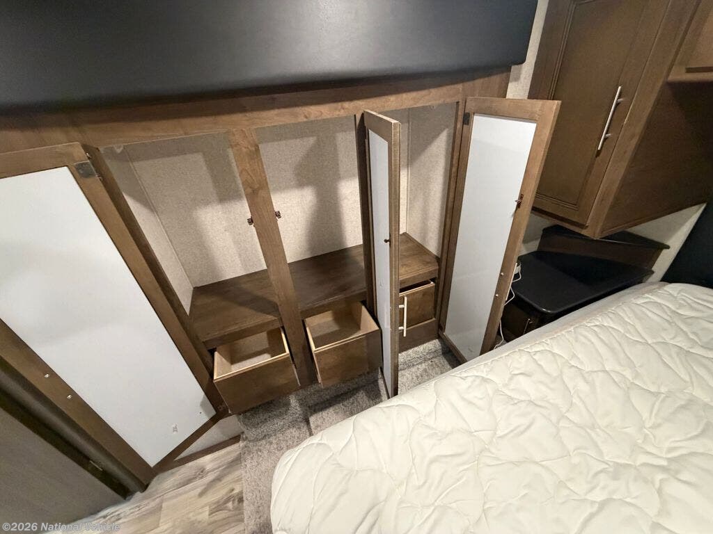 One of the standout features is the full bathroom with a large shower and dual entry privacy doors, providing convenient access from both the bedroom and main living area. The front bedroom includes a queen walk-around bed with storage, creating a comfortable and private retreat.