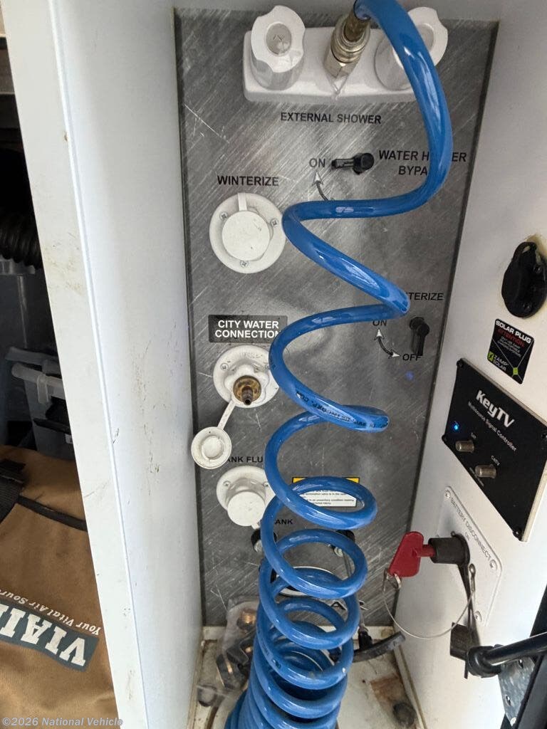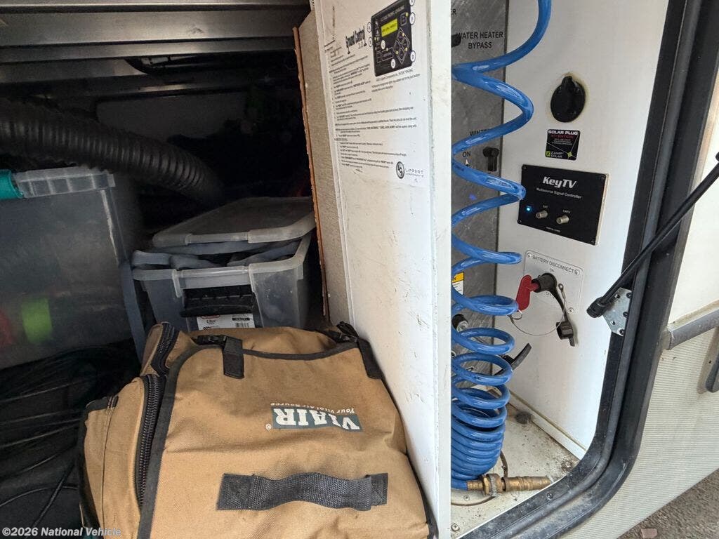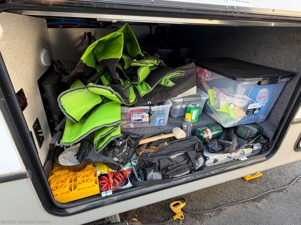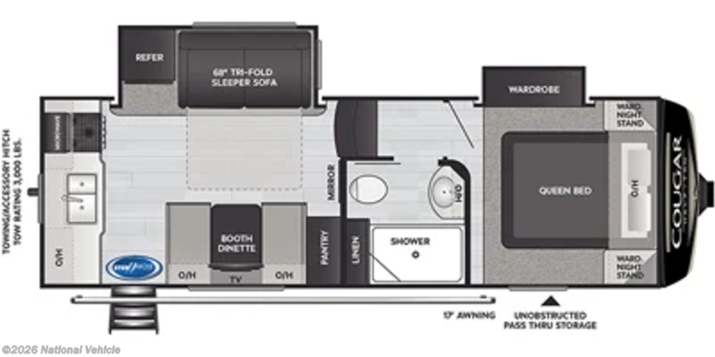 This Cougar is well-equipped for comfort and convenience, featuring power leveling, a power awning, outdoor shower, and prepped for a second A/C unit. Climate control includes a 15,000 BTU A/C and 35,000 BTU furnace, ensuring comfort in a variety of conditions. Additional upgrades include backup and side cameras, GPS, an Anderson hitch, and a receiver hitch for added versatility.