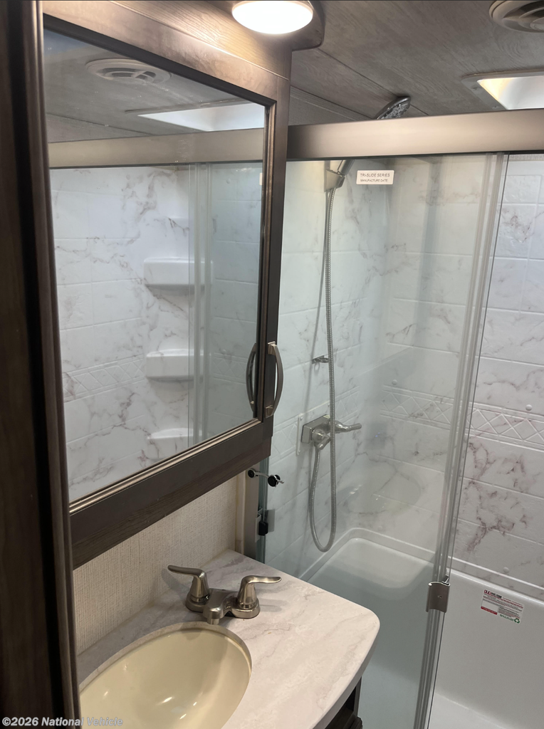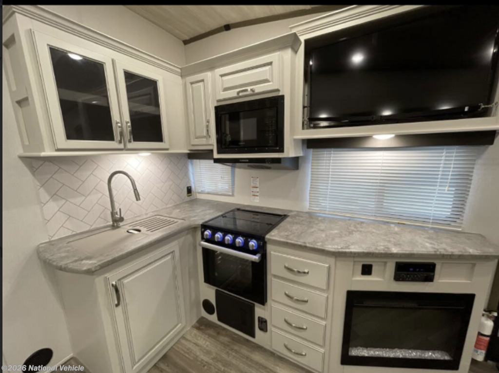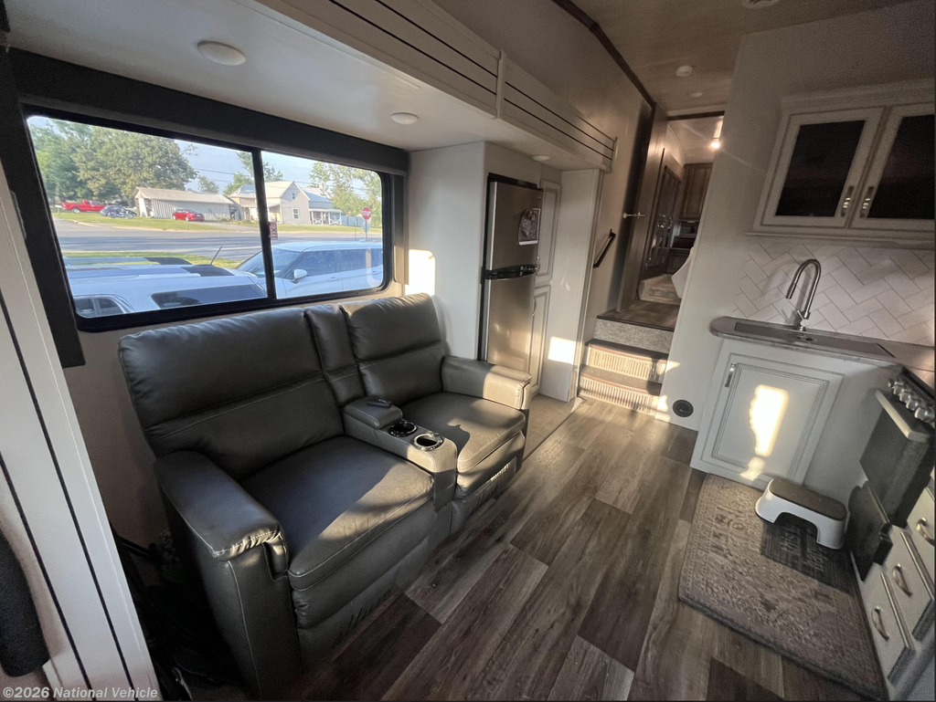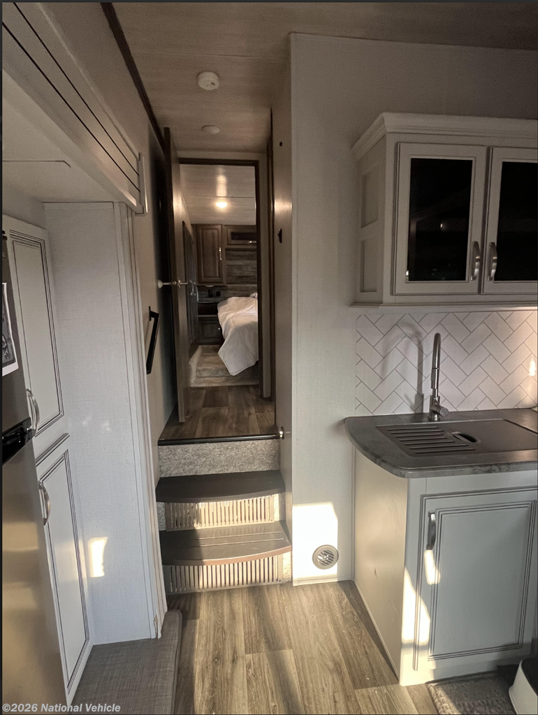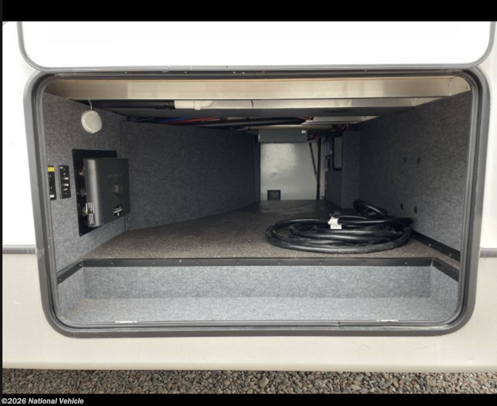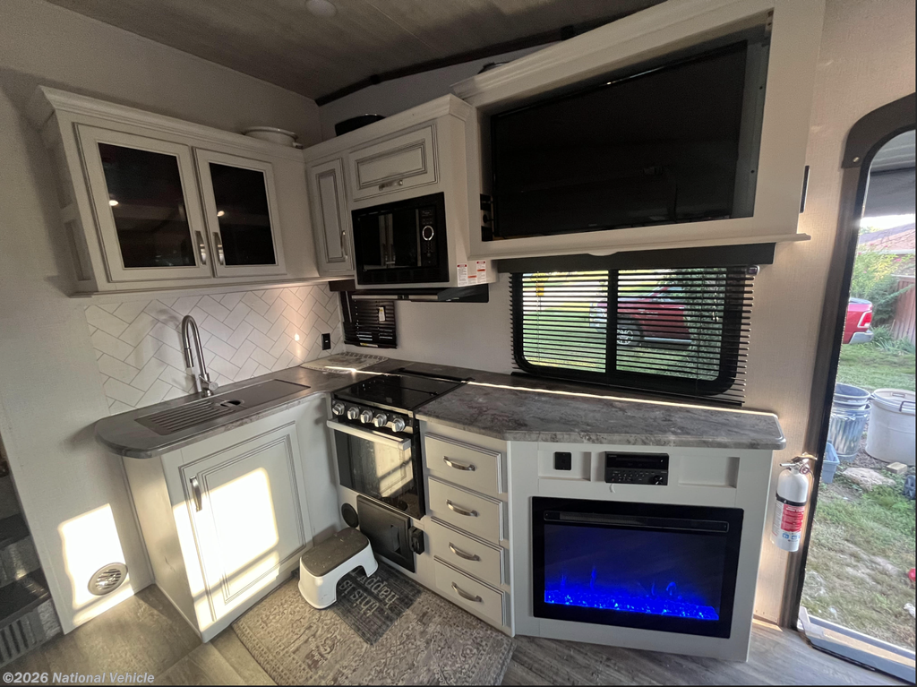 A new refrigerator ensures dependable cooling for longer stays, while the electric fireplace adds cozy ambiance and supplemental heat on cool evenings. Ample cabinetry and smart storage solutions make extended trips easy, and outside, you?ll love the large pass-through storage accessible from both sides, perfect for camping gear and larger essentials.