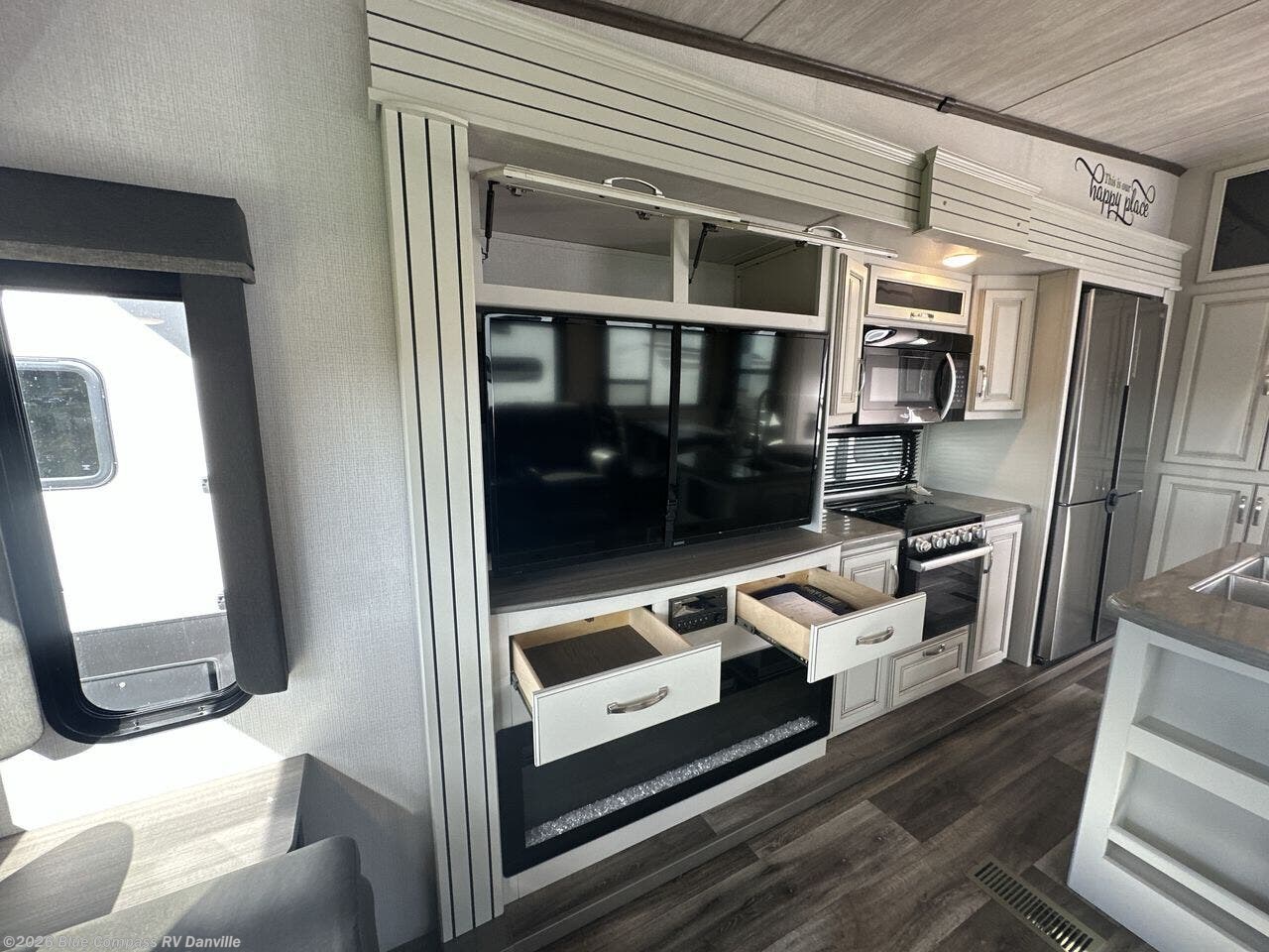 You will love the view from the Patent-Pending windshield design as well as the spacious bedroom with a third wardrobe within a slide out. The full bathroom is just a few steps down the hallway and includes everything you will need to stay refreshed for shopping in town or taking a hike. The central living area has two opposing slides giving you extra space around the kitchen island as you prep for meals and wash dishes in the undermount sink with the faucet and sprayer. Your friends and family will be able to watch the TV from the theater seats, the tri-fold sleeper sofa with end tables and/or the legless dinette table, and the fireplace will make those chilly nights cozy. And the MORRyde solid step, the two power awnings, the unobstructed pass-through compartment and 2" accessory hitch will come in handy when you are outside.