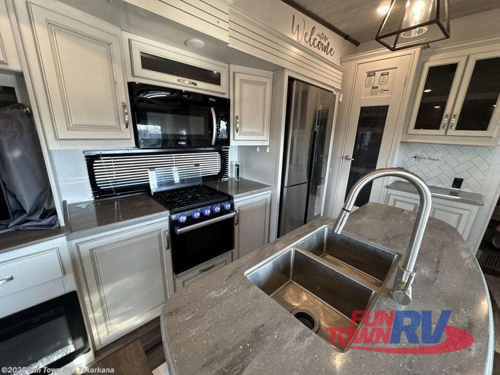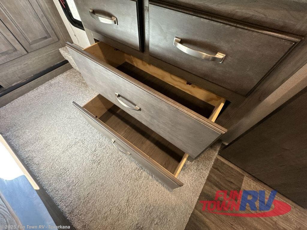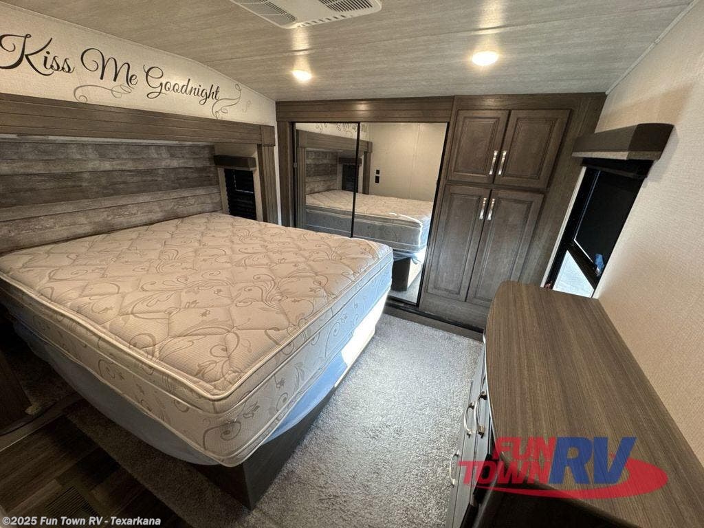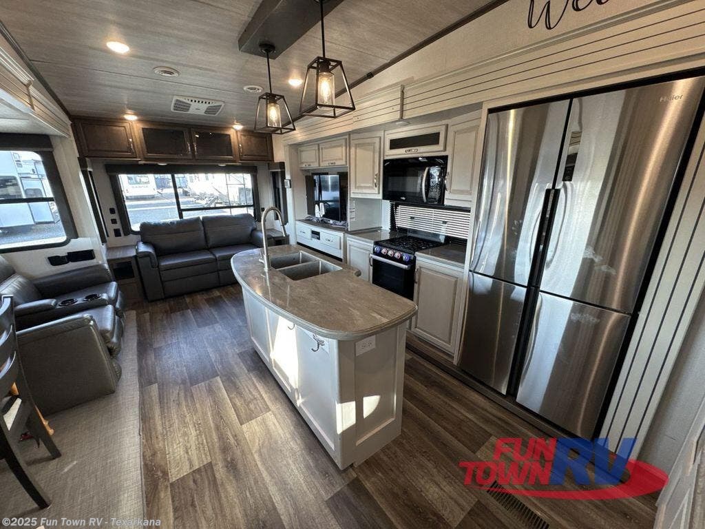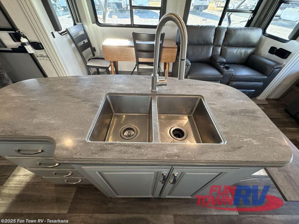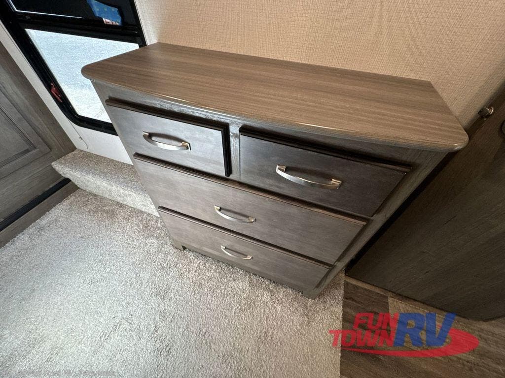 Whether you are a full-timer or family weekend warrior, you will find sleeping space for five to six when you utilize the furniture at night. The spacious living and kitchen area offers theater seating, a tri-fold sleeper sofa and a legless dinette table. Now you might like to change out a few things and add a free standing dinette option and/or a larger refrigerator option. The kitchen island gives you extra space to prep and serve meals, a double sink with faucet and sprayer, plus the hutch and pantry will give you more storage. You can take turns getting ready in the bathroom, two at a time with the two sinks. Retire to your master bedroom at night complete with a queen bed slide and storage underneath as well as a full height wardrobe and a space prepped for a washer/dryer option.