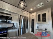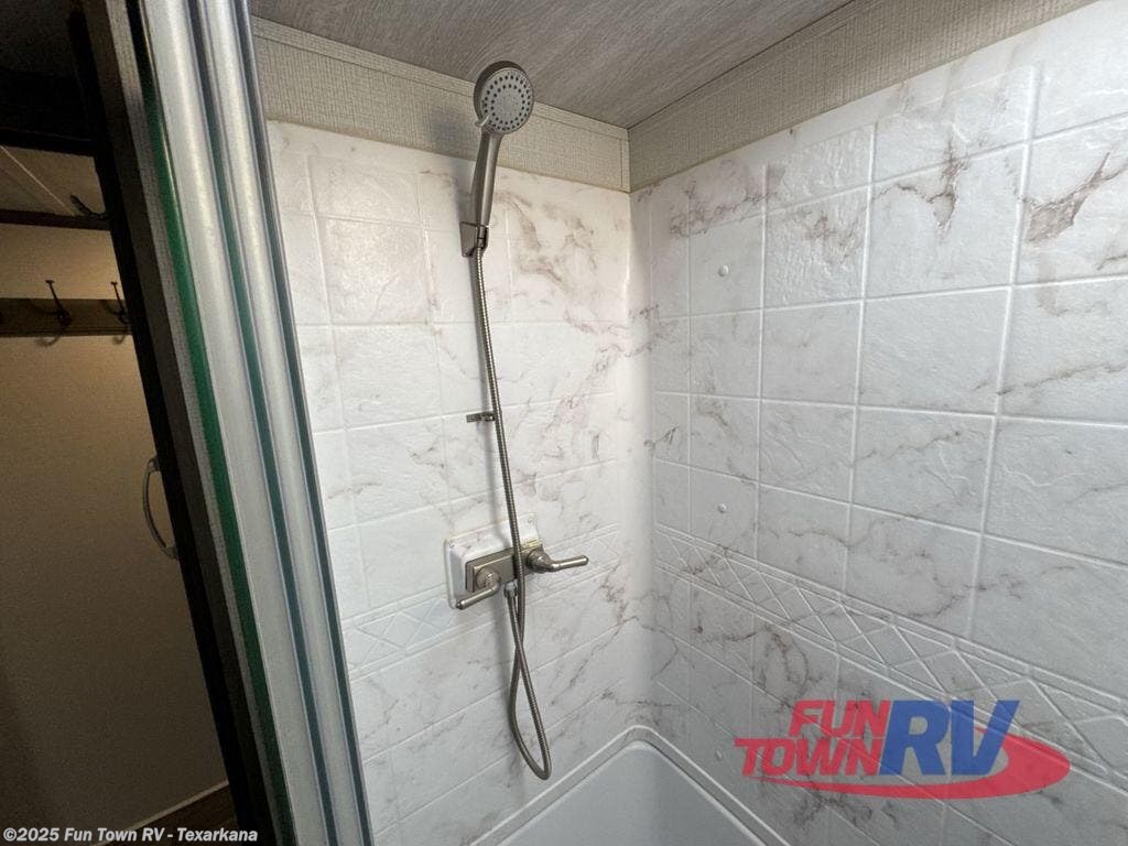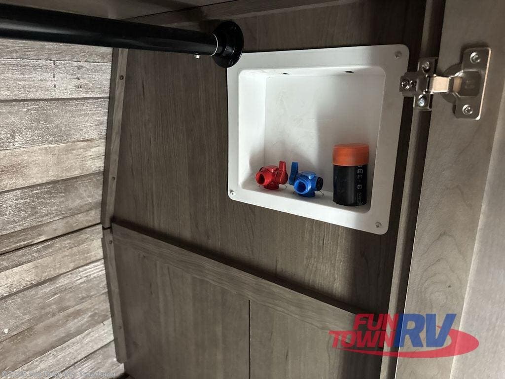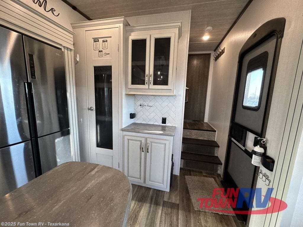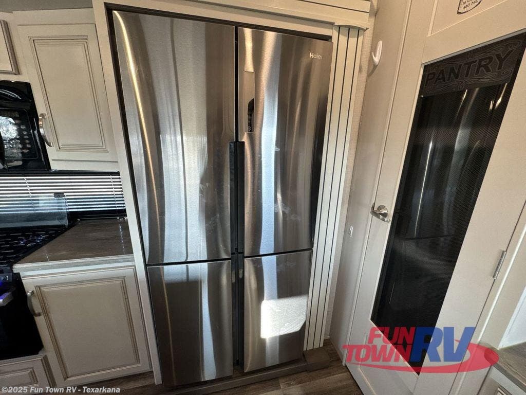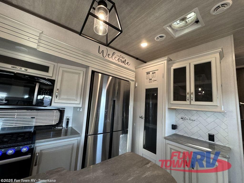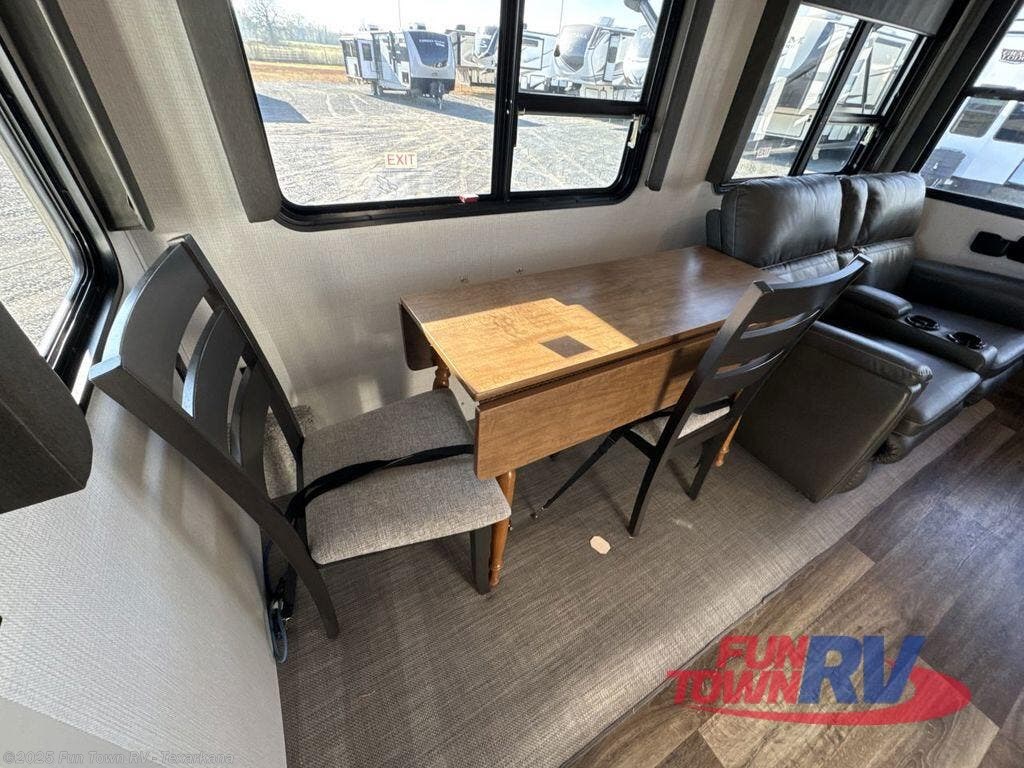 Whether you are a full-timer or family weekend warrior, you will find sleeping space for five to six when you utilize the furniture at night. The spacious living and kitchen area offers theater seating, a tri-fold sleeper sofa and a legless dinette table. Now you might like to change out a few things and add a free standing dinette option and/or a larger refrigerator option. The kitchen island gives you extra space to prep and serve meals, a double sink with faucet and sprayer, plus the hutch and pantry will give you more storage. You can take turns getting ready in the bathroom, two at a time with the two sinks. Retire to your master bedroom at night complete with a queen bed slide and storage underneath as well as a full height wardrobe and a space prepped for a washer/dryer option.