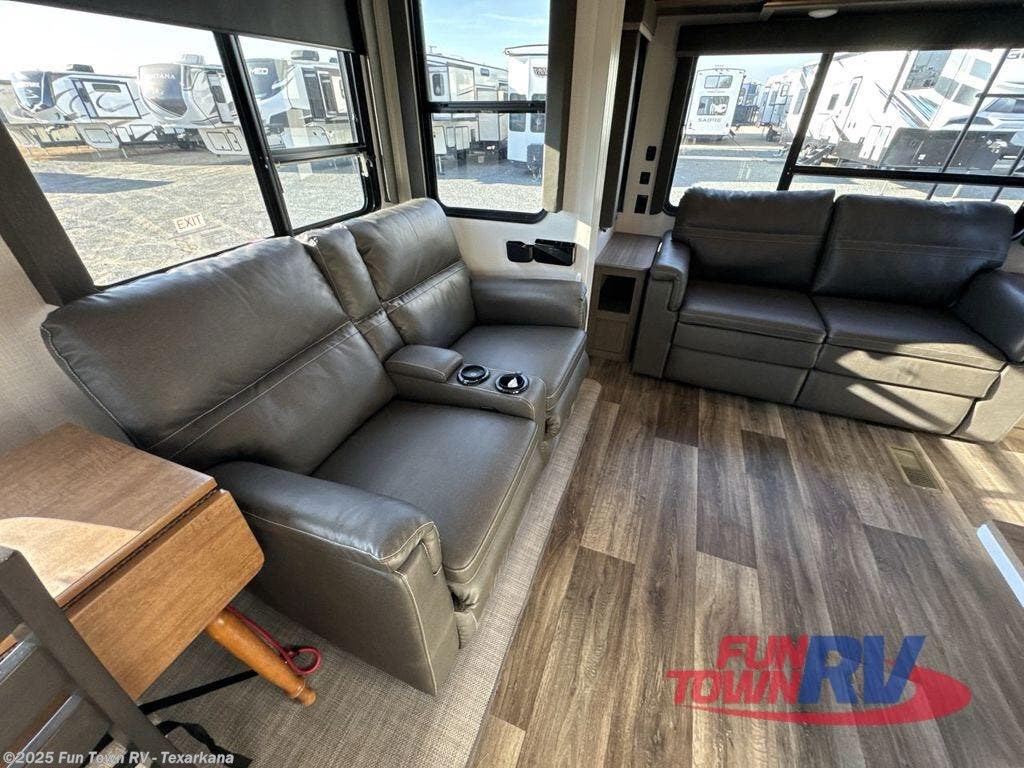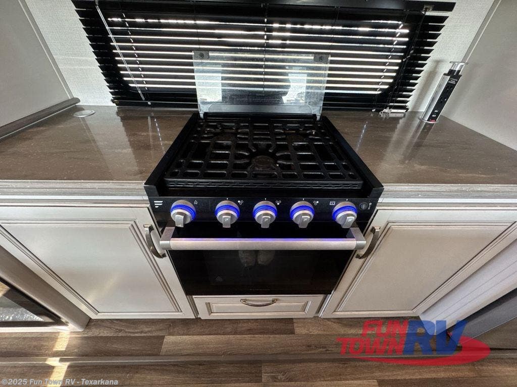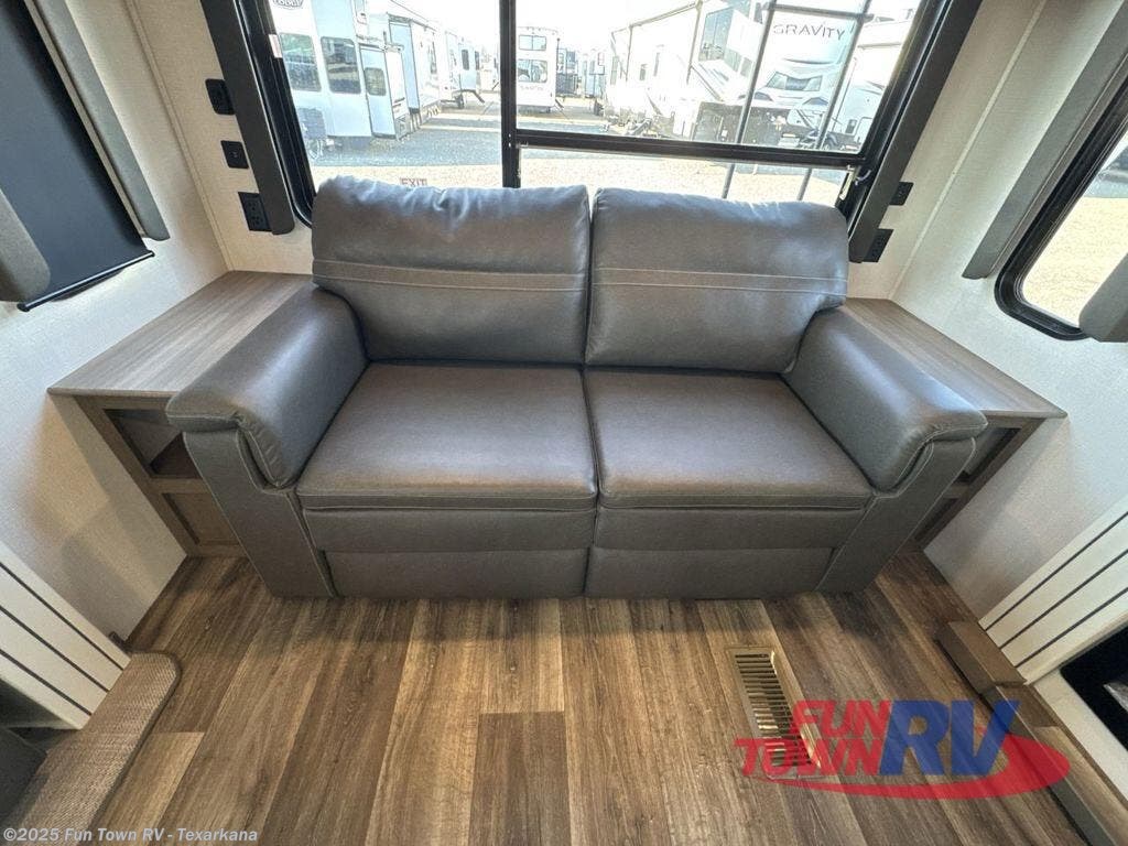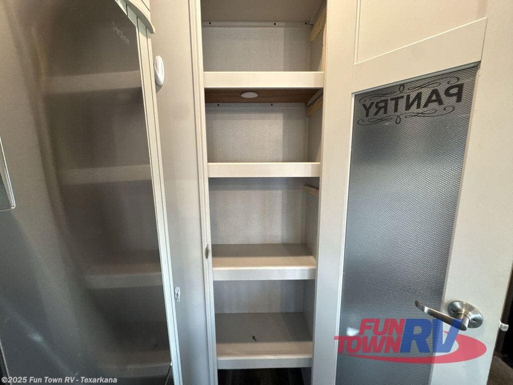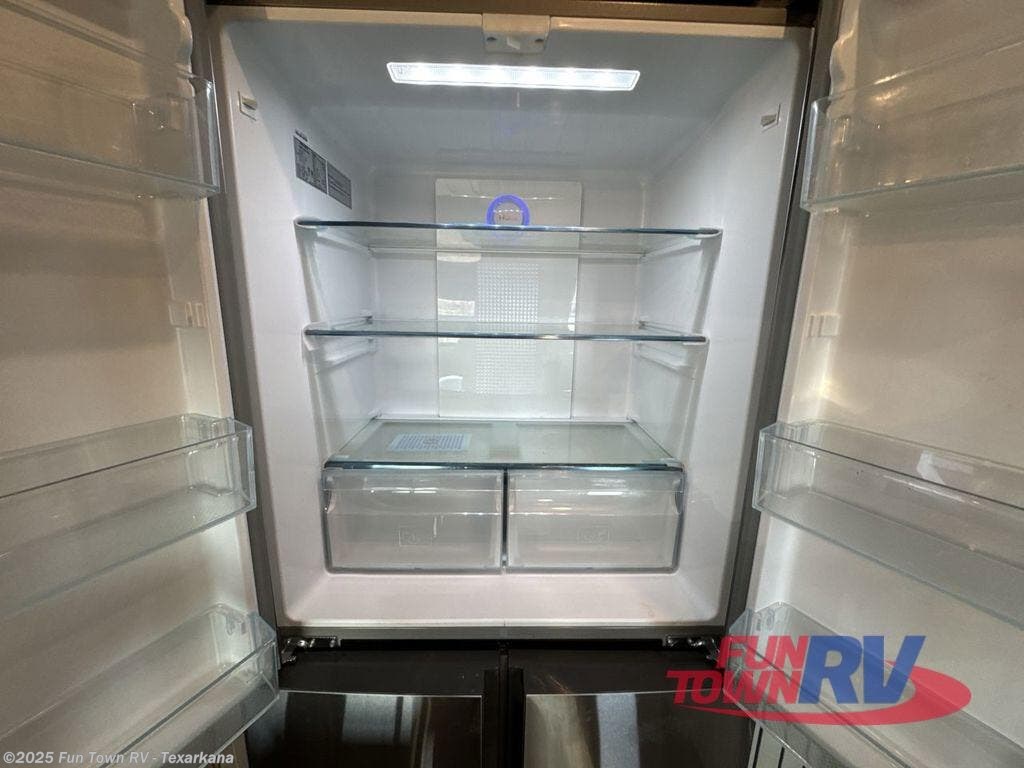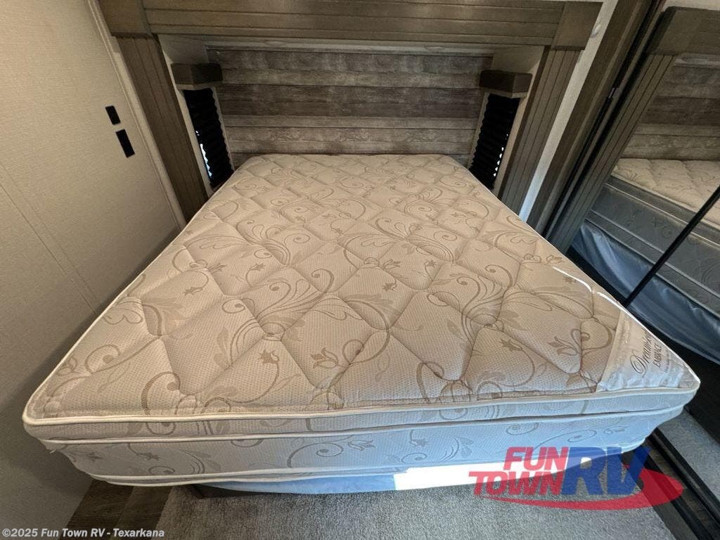 Whether you are a full-timer or family weekend warrior, you will find sleeping space for five to six when you utilize the furniture at night. The spacious living and kitchen area offers theater seating, a tri-fold sleeper sofa and a legless dinette table. Now you might like to change out a few things and add a free standing dinette option and/or a larger refrigerator option. The kitchen island gives you extra space to prep and serve meals, a double sink with faucet and sprayer, plus the hutch and pantry will give you more storage. You can take turns getting ready in the bathroom, two at a time with the two sinks. Retire to your master bedroom at night complete with a queen bed slide and storage underneath as well as a full height wardrobe and a space prepped for a washer/dryer option.