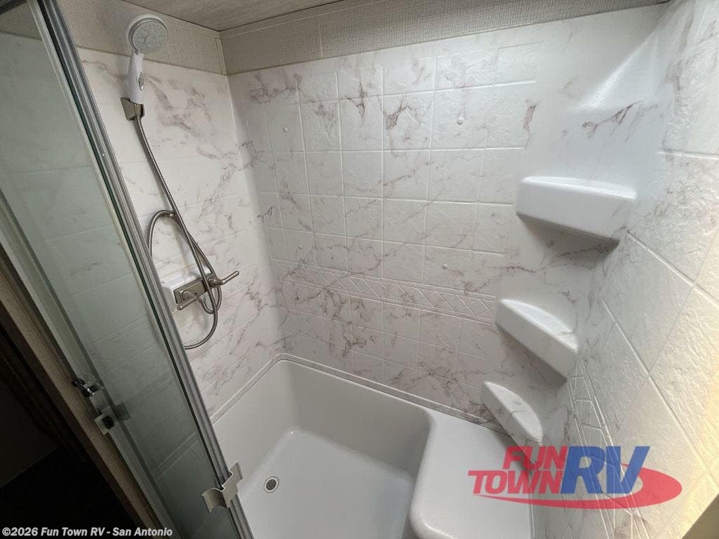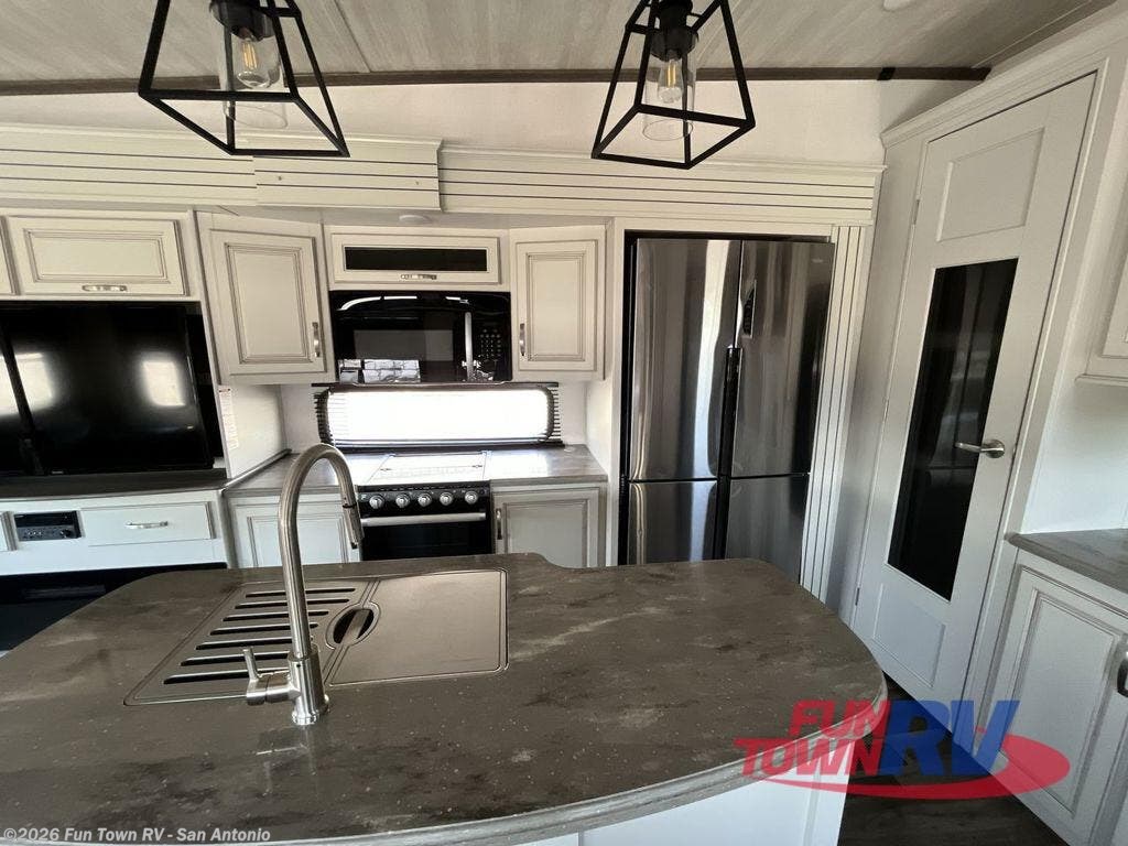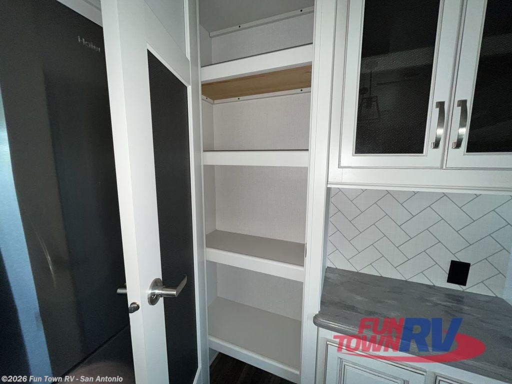 Whether you are a full-timer or family weekend warrior, you will find sleeping space for five to six when you utilize the furniture at night. The spacious living and kitchen area offers theater seating, a tri-fold sleeper sofa and a legless dinette table. Now you might like to change out a few things and add a free standing dinette option and/or a larger refrigerator option. The kitchen island gives you extra space to prep and serve meals, a double sink with faucet and sprayer, plus the hutch and pantry will give you more storage. You can take turns getting ready in the bathroom, two at a time with the two sinks. Retire to your master bedroom at night complete with a queen bed slide and storage underneath as well as a full height wardrobe and a space prepped for a washer/dryer option.