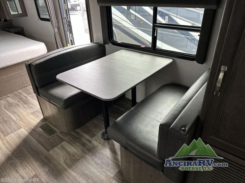 With a king-size bed, this Cougar Half-Ton travel trailer shows that you can still be comfortable even while you're away from home! The bed has wardrobes and nightstands on either side, and it also has a privacy curtain to section it off from the rest of the trailer. When you use the MORryde Solid Step entry to get inside, you'll notice and appreciate the shoe cubby to your left. Right next to the booth dinette is the pantry, and next to the pantry is the full bathroom which is certainly one of the most valuable features to any trailer.