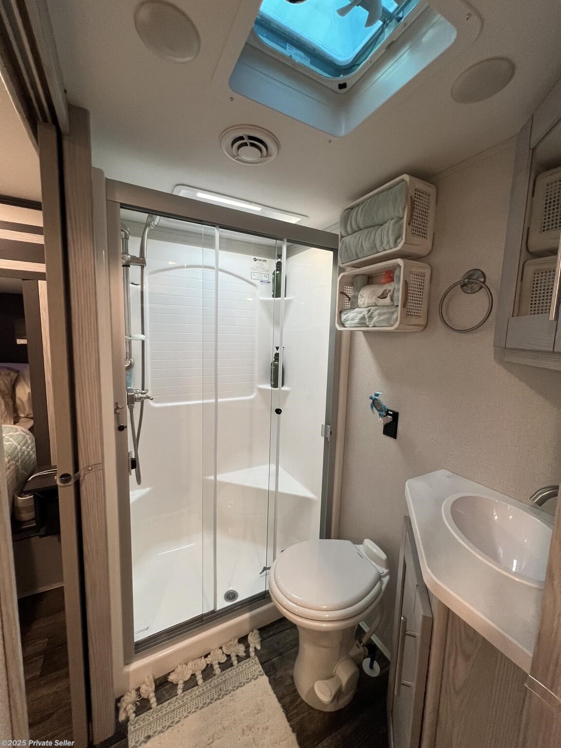 This 2021 Keystone Fuzion 424 is outfitted with all the features you need for happy camping. Ready to be a proud Keystone owner? This 2021 Keystone Fuzion 424 is the perfect fit. This rig sleeps 8, so it makes the perfect family RV. With three slides, this rig feels roomy and spacious inside. The fridge, oven, stove make the perfect combo for eating well on the road. This huge fridge allows you to easily bring along meals that feed the whole family. Keep a comfortable temperature inside your rig with the heating option. Outside, you’ll find external shower, power roof vent and slideout. An outside shower makes it easier to keep your adventure rig clean.