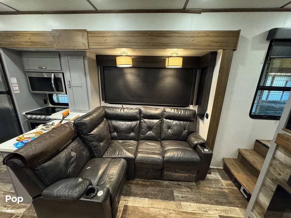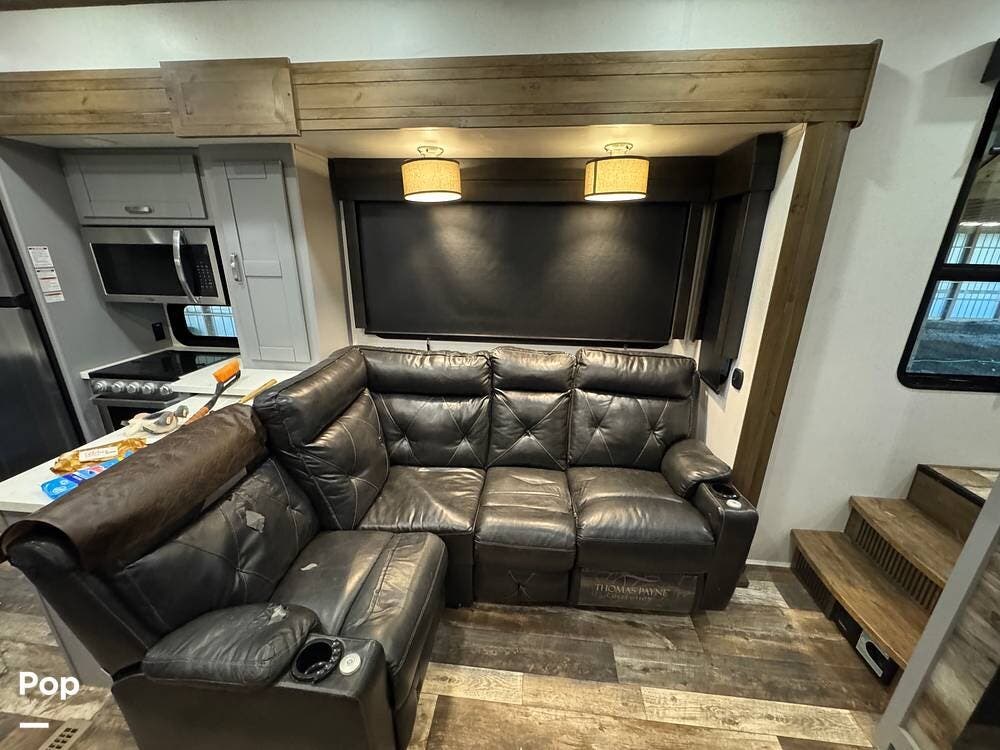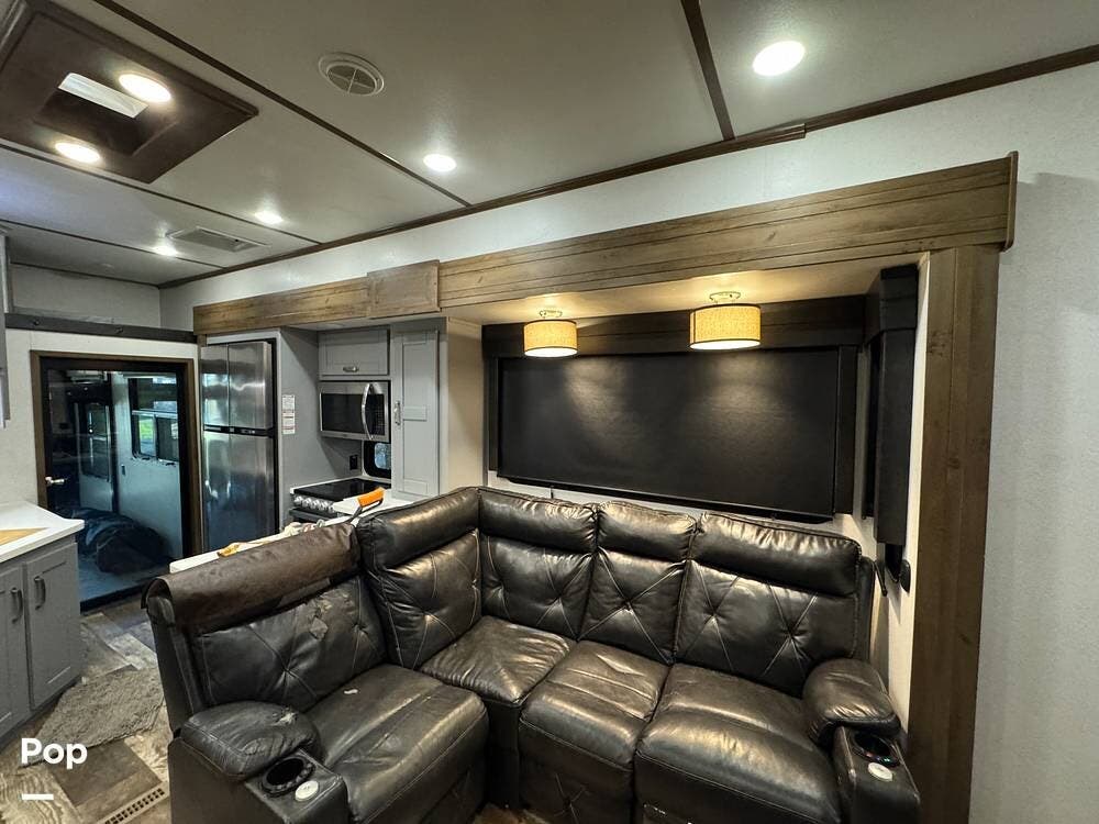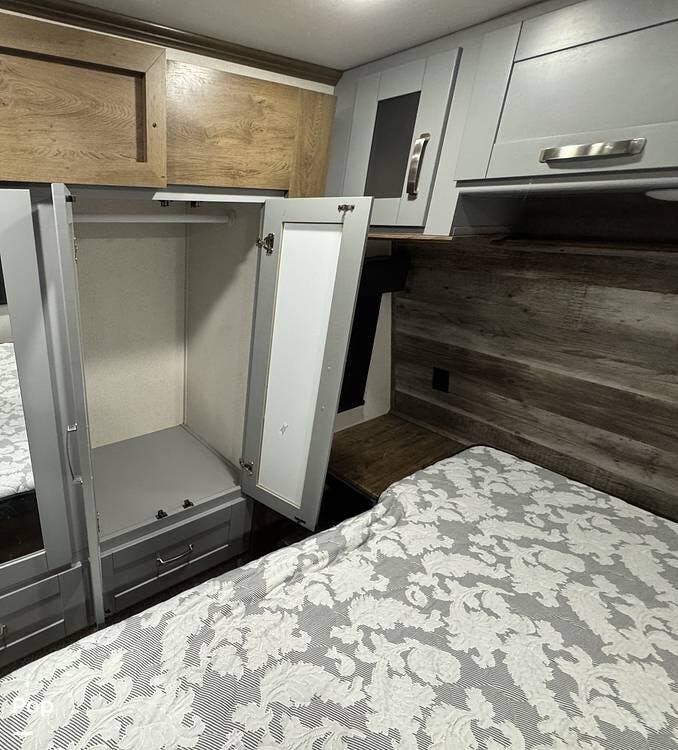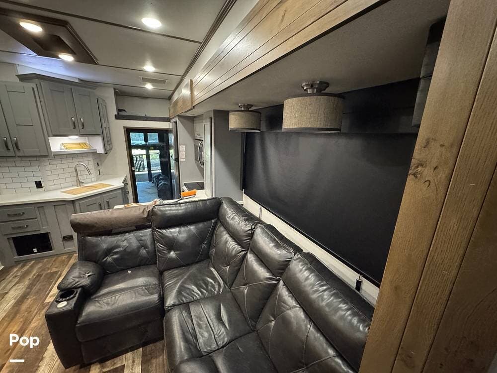 The current owners have truly enjoyed the spacious living area, noting how easy it is to entertain friends and family with features like the 50" TV, electric fireplace, and heated theater seating, which really make this coach feel like home.