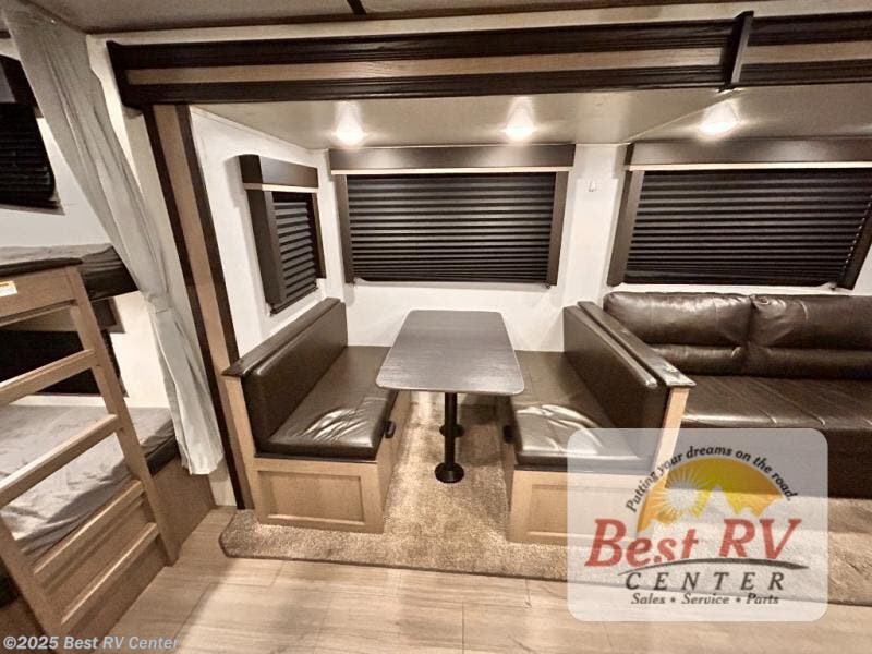 The kids will love having their own set of double-size bunks in this Hideout travel trailer! The bunks are conveniently located right next to the rear corner bathroom. After you have prepared a delicious home cooked meal with the three-burner cooktop, then you can head to the booth dinette to enjoy it, and if there are any leftovers, you can easily store them in the 8 cu. ft. refrigerator. A few other features you will love are the central vacuum system, the fireplace, and the jackknife sofa, plus you can add the optional 40" HDTV to the entertainment center. The front private bedroom welcomes you to a good night's rest on the queen bed to start each day refreshed!