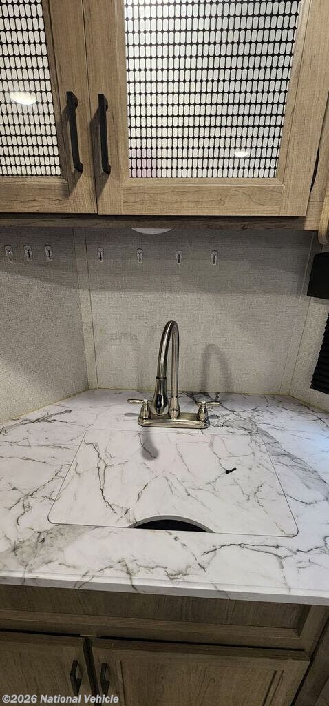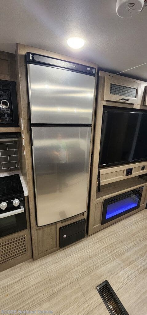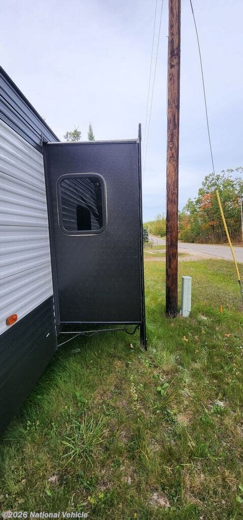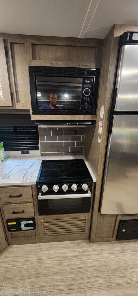 The fully equipped kitchen includes modern appliances like a 3-burner stove, oven, microwave, large refrigerator, and a deep stainless steel sink, giving you everything you need to cook on the road. A spacious bathroom with a tub/shower combo and exterior access door adds extra convenience ? especially when camping with family or friends.