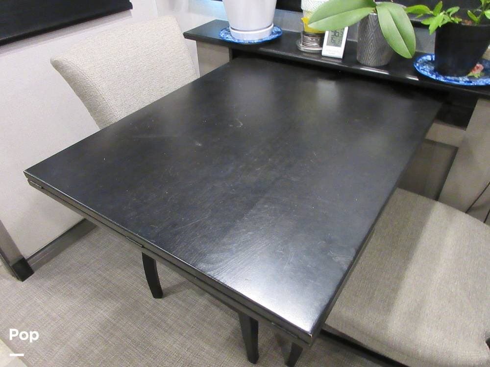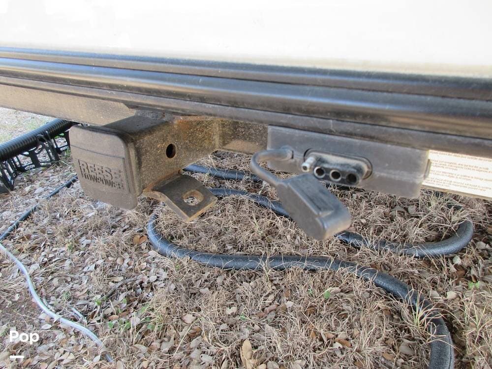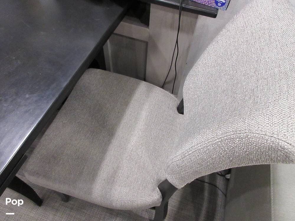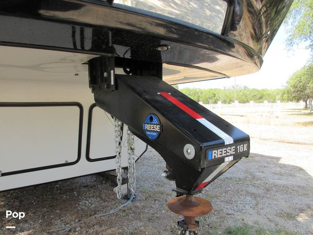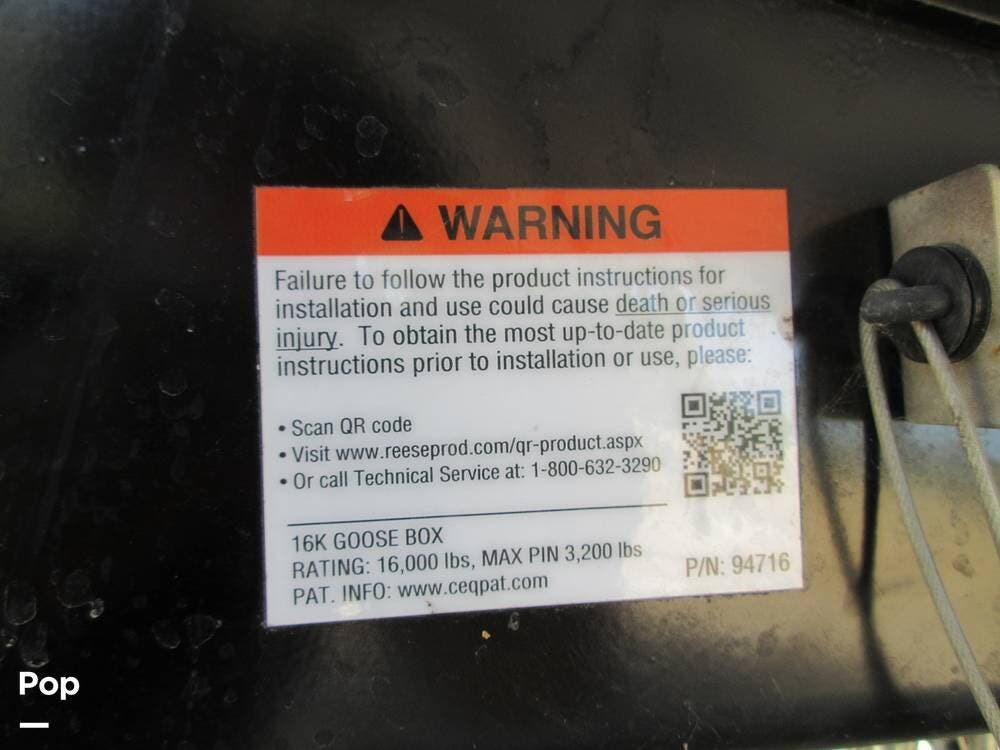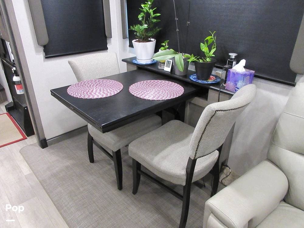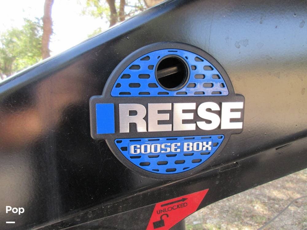 Extras include a central vacuum system, a backup camera, two extra dining chairs, and more. This RV has a Reese Goose Box hitch installed for towing. However, the original fifth-wheel hitch is also available if you prefer that option.