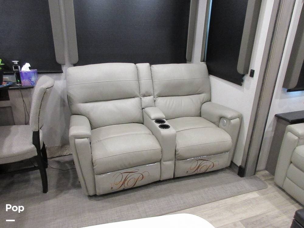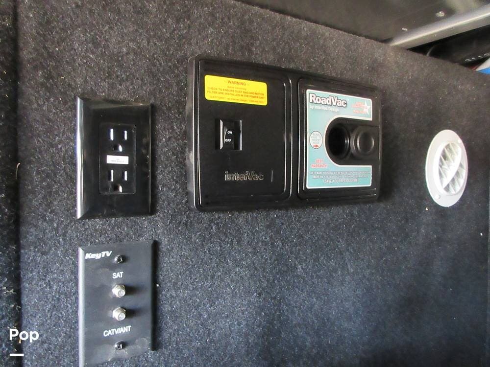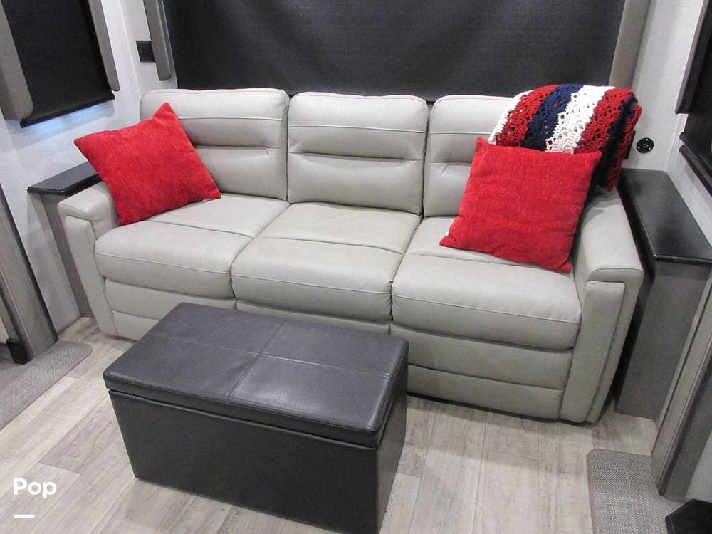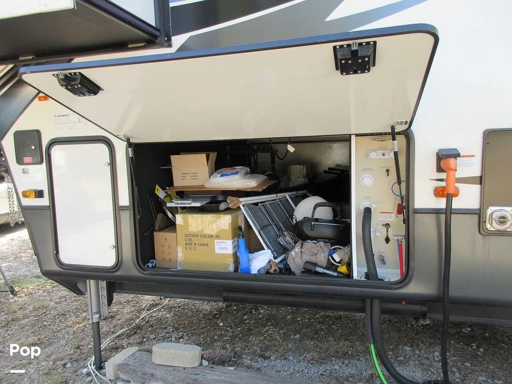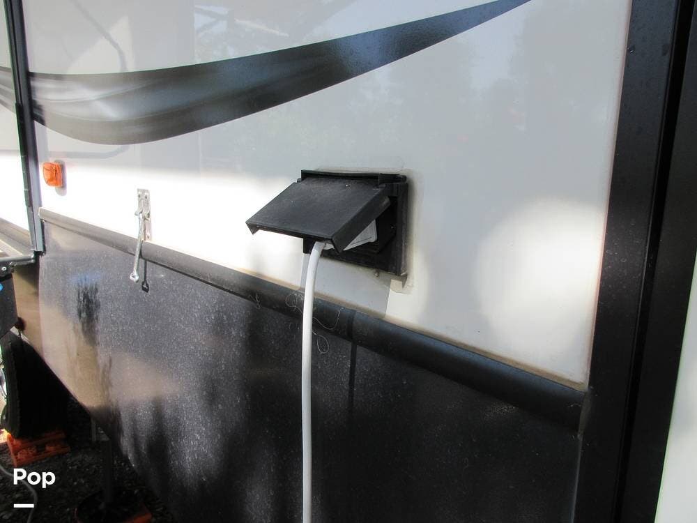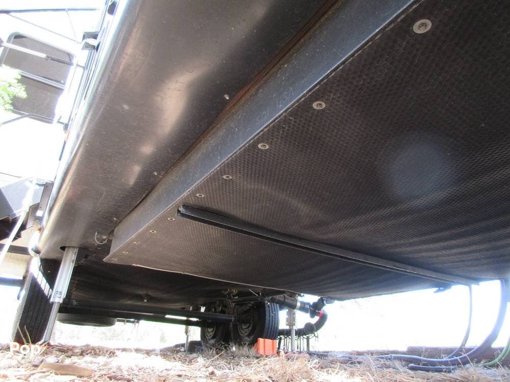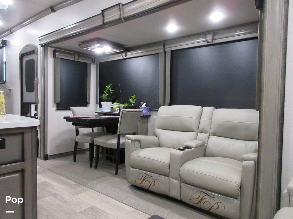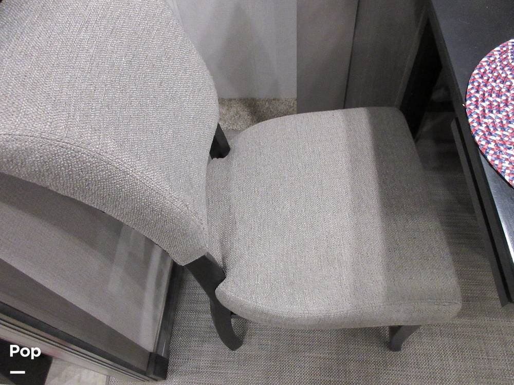Extras include a central vacuum system, a backup camera, two extra dining chairs, and more. This RV has a Reese Goose Box hitch installed for towing. However, the original fifth-wheel hitch is also available if you prefer that option.