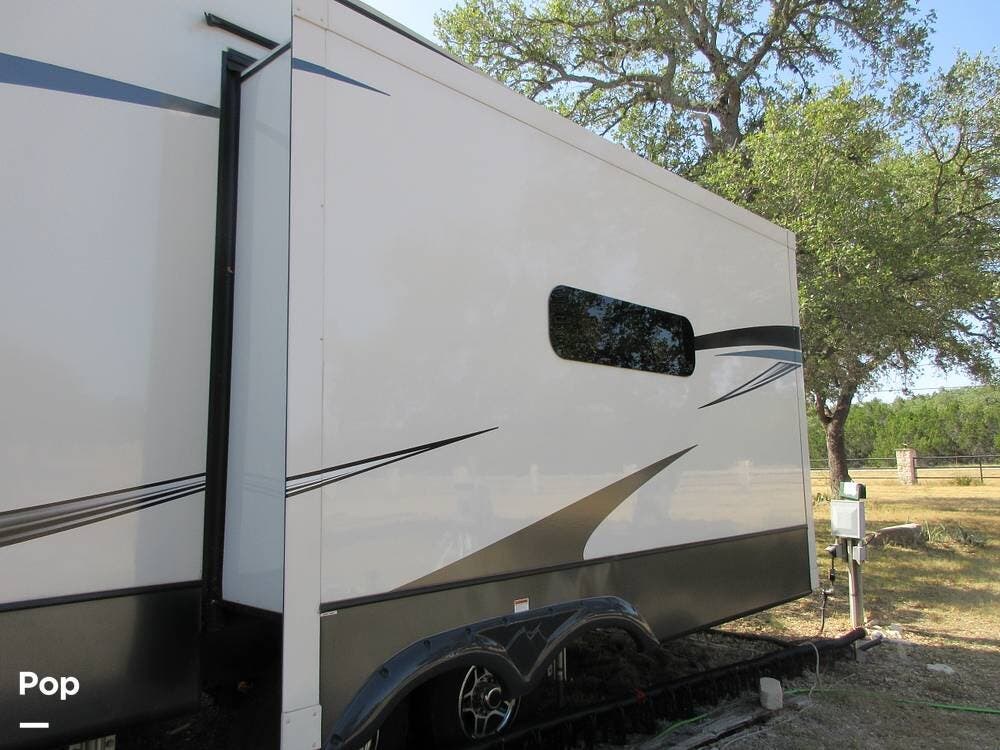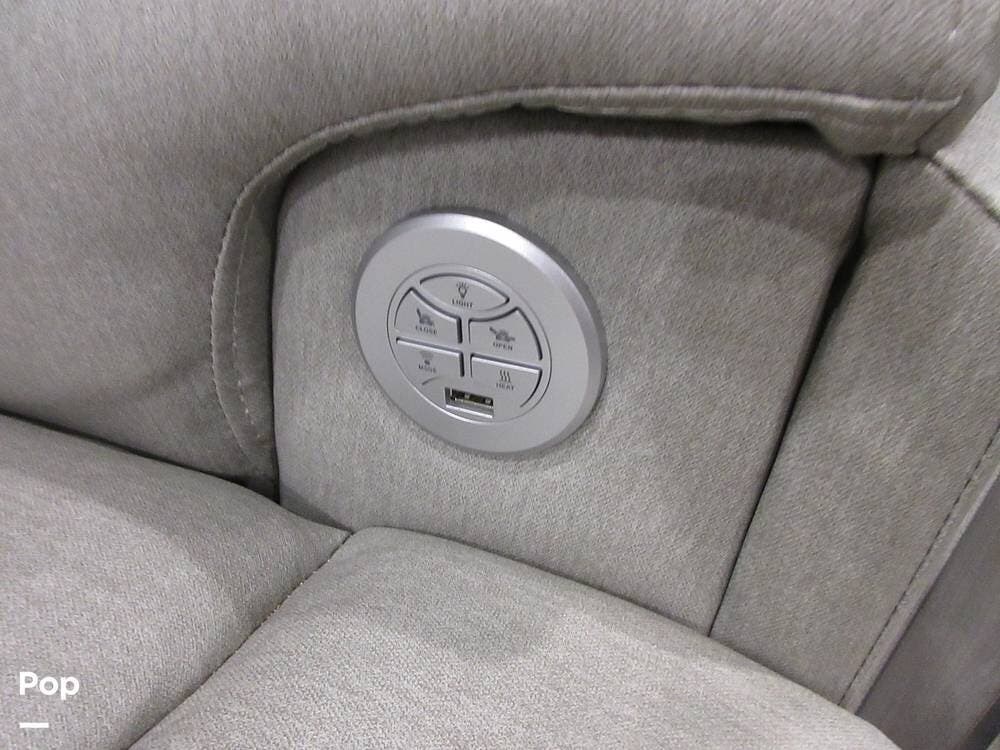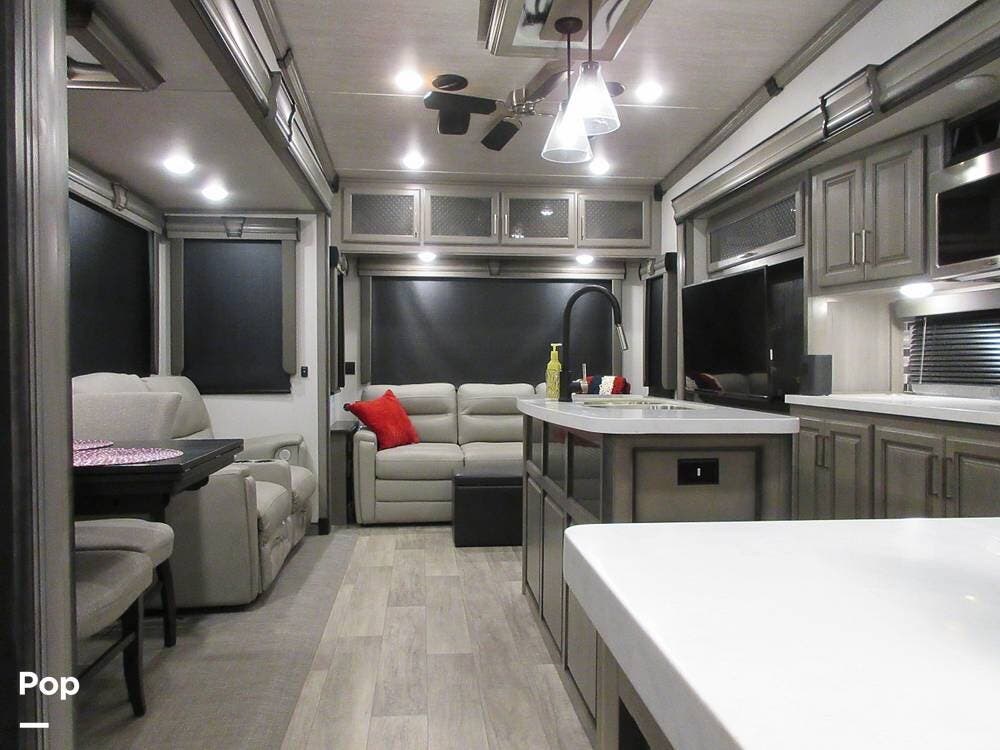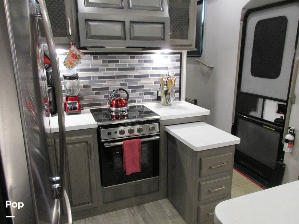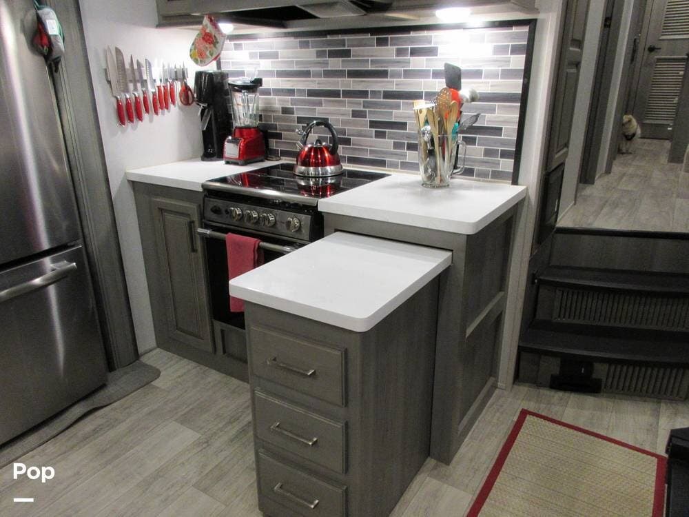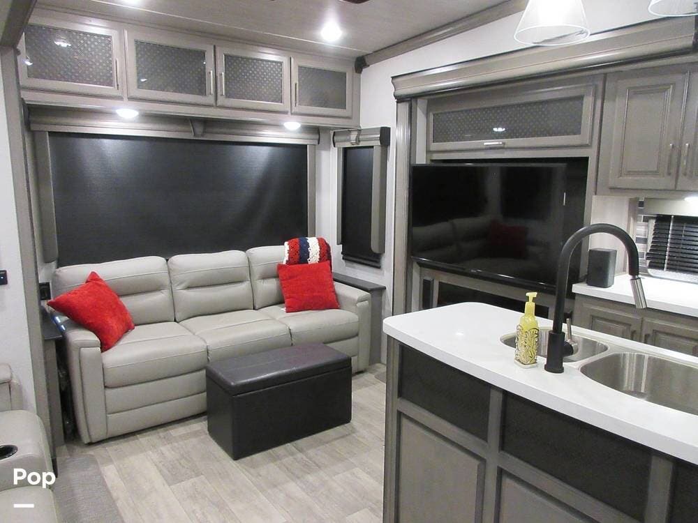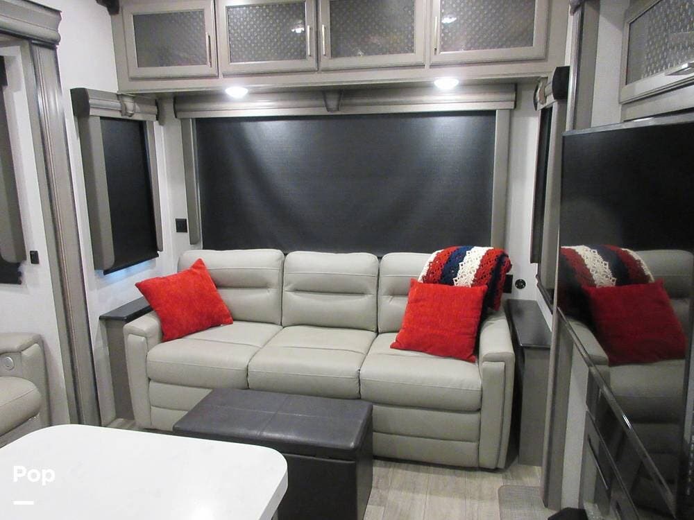 Extras include a central vacuum system, a backup camera, two extra dining chairs, and more. This RV has a Reese Goose Box hitch installed for towing. However, the original fifth-wheel hitch is also available if you prefer that option.