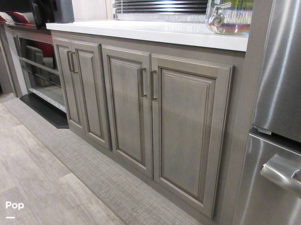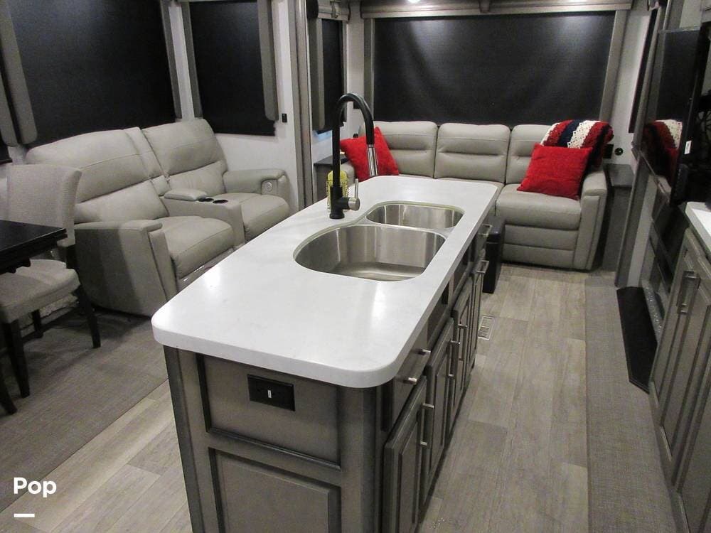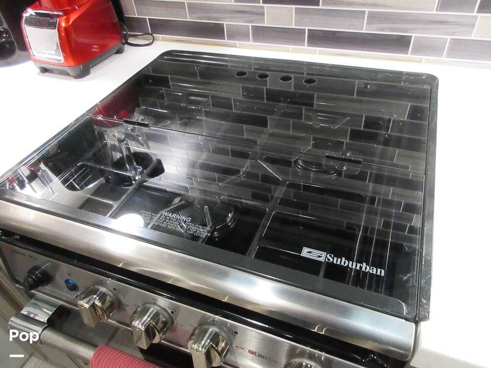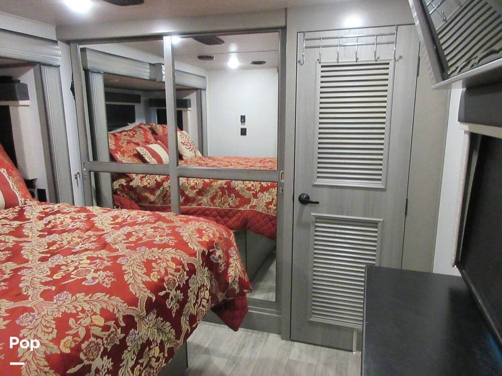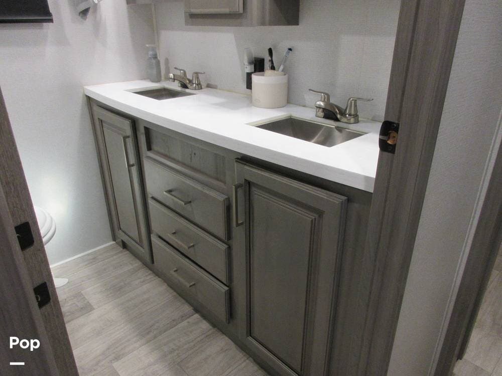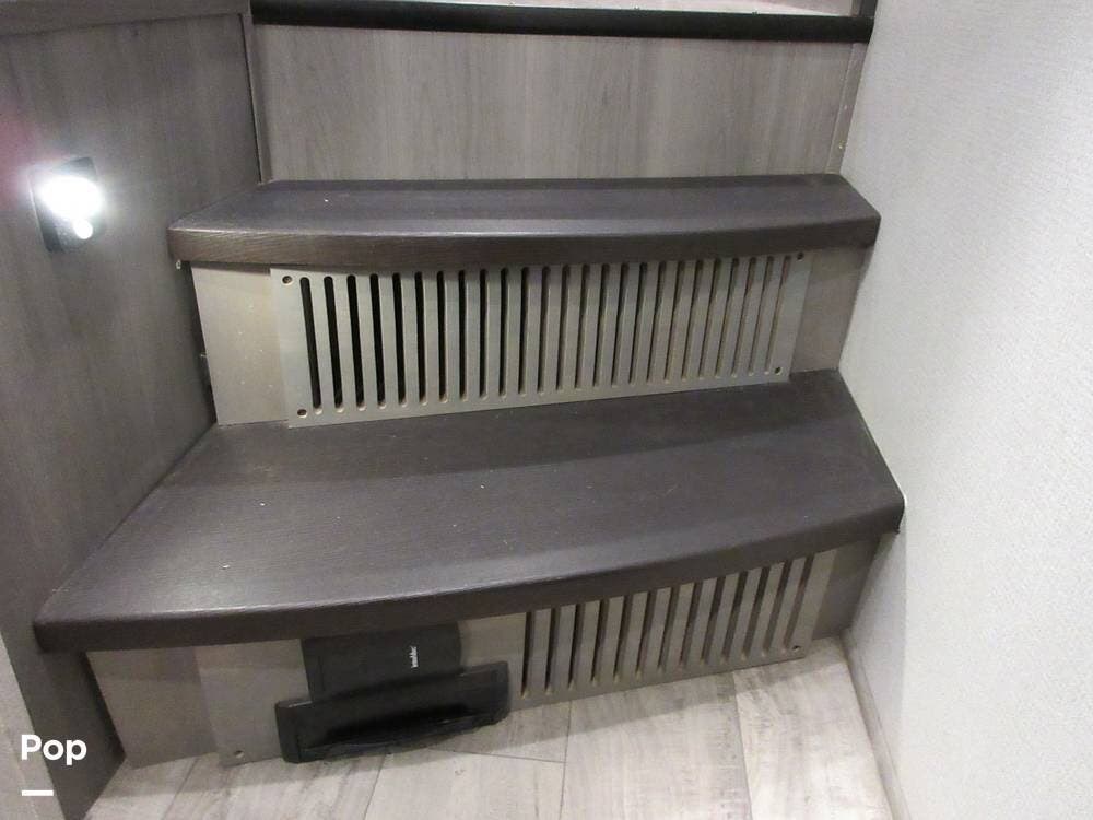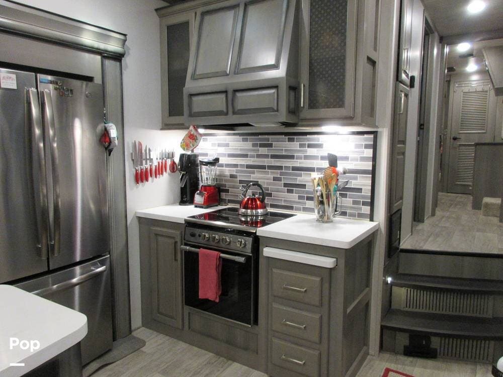 Extras include a central vacuum system, a backup camera, two extra dining chairs, and more. This RV has a Reese Goose Box hitch installed for towing. However, the original fifth-wheel hitch is also available if you prefer that option.