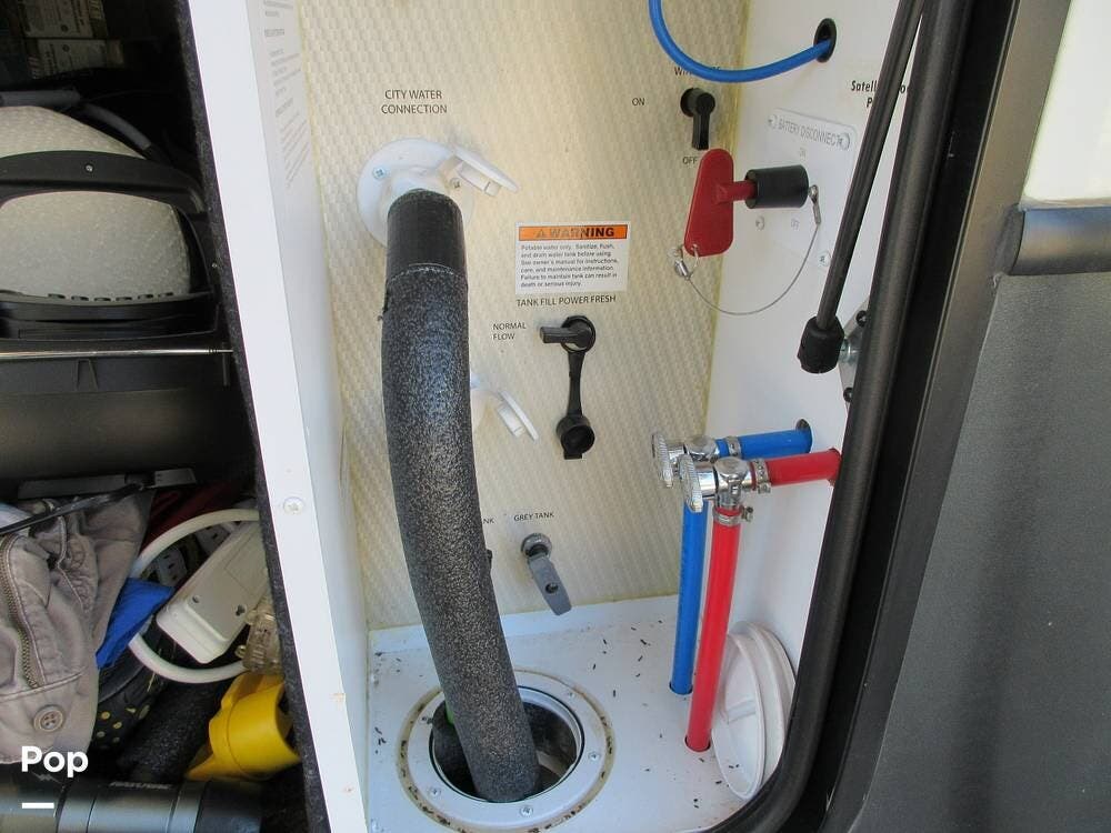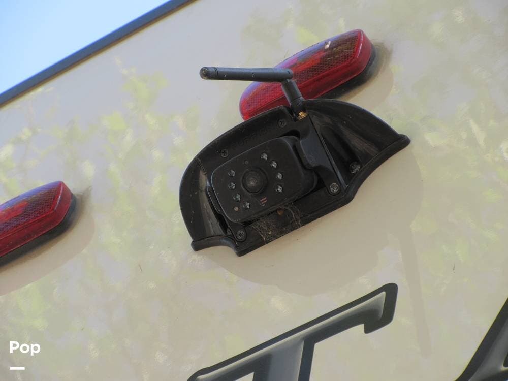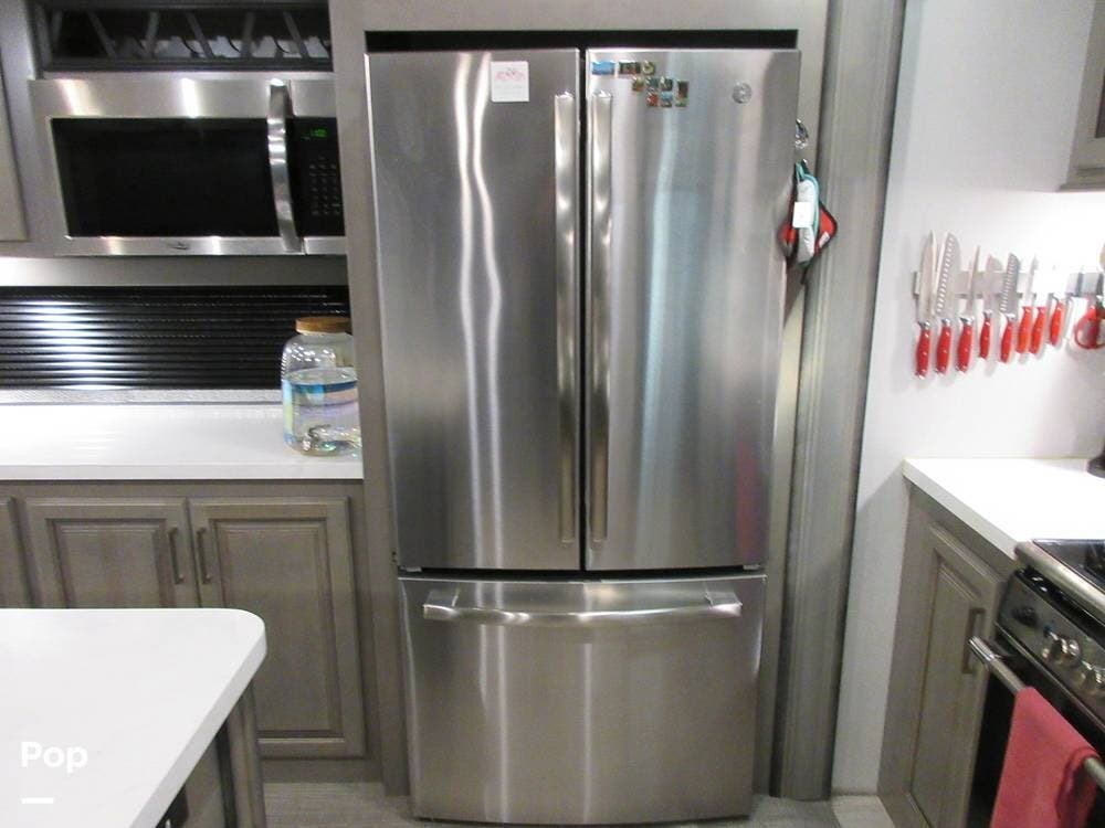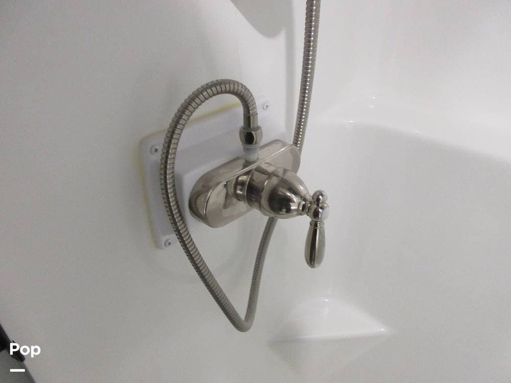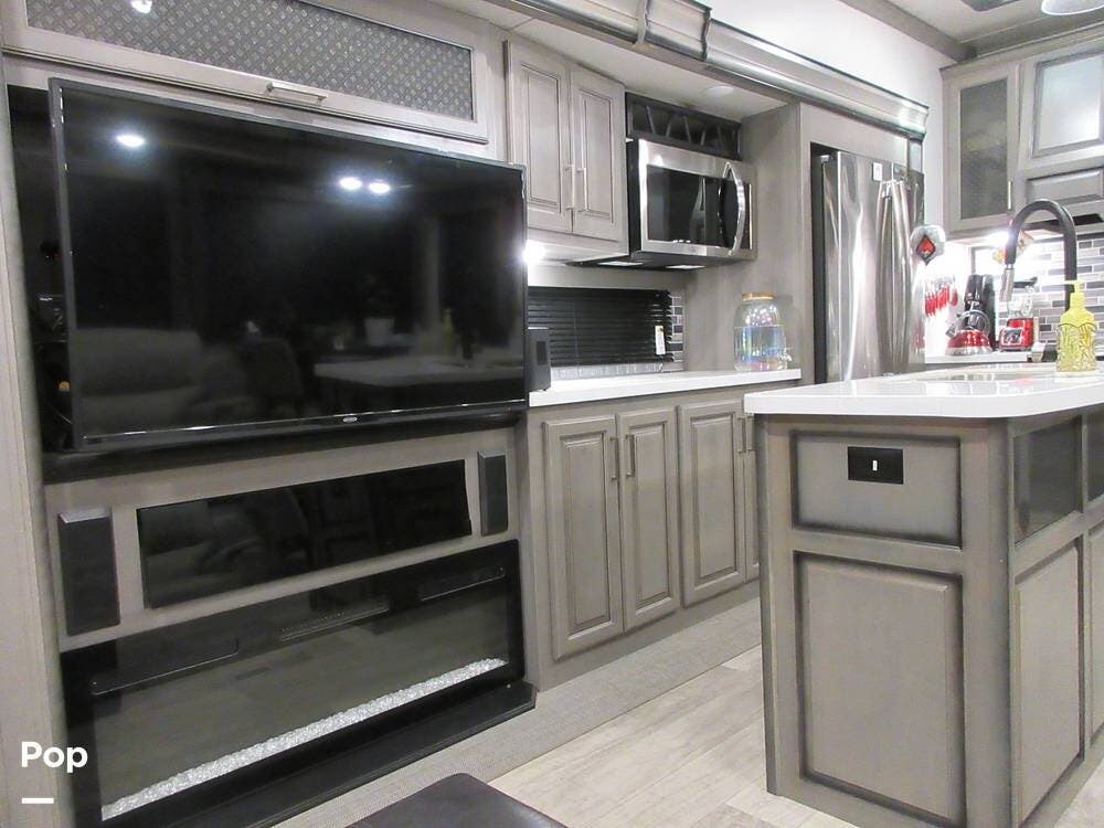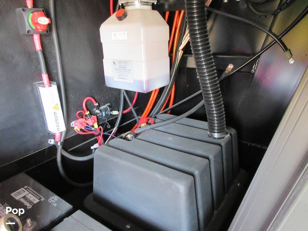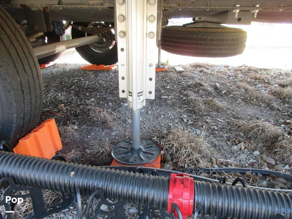 Extras include a central vacuum system, a backup camera, two extra dining chairs, and more. This RV has a Reese Goose Box hitch installed for towing. However, the original fifth-wheel hitch is also available if you prefer that option.