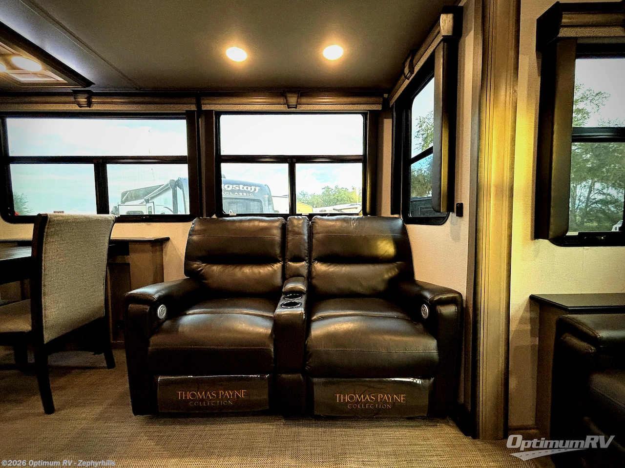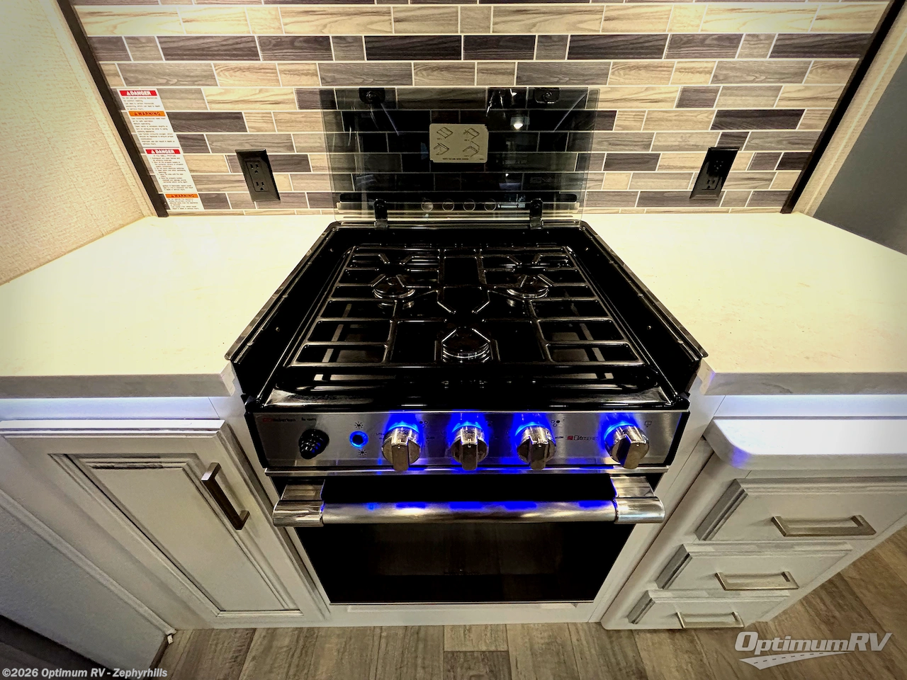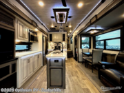 This Montana fifth wheel is absolutely amazing, and it will be extremely useful when it comes time for another getaway! One feature that makes this fifth wheel so great is the front private bedroom. This bedroom has a barn door that closes it off, and it also has a queen bed slide, a full-width closet with a space prepped for the optional washer/dryer, under-bed storage, a dresser, and a 32" LED HDTV. Right next to the bedroom is the bathroom that has a dual-sink vanity and 48" x 30" shower, and when you head out into the main living area, you will find lots of living space thanks to the opposing slides. Take a load off and sit back on the power theater seating, or you can sit down with a snack at the dinette with four chairs and storage. The kitchen also provides you with lots of amenities, like two pull-out pantries, a pull-out countertop, an island, an 18-cubic foot residential refrigerator, and a residential range hood.