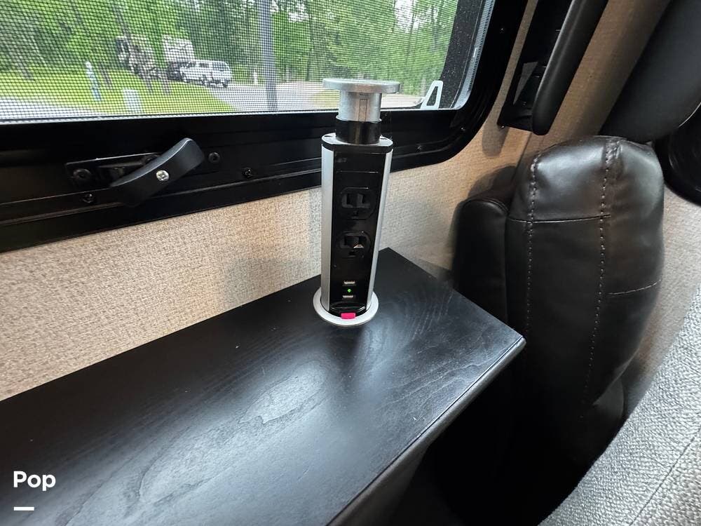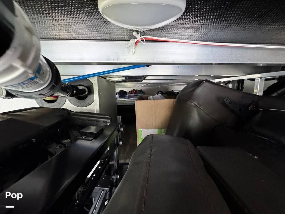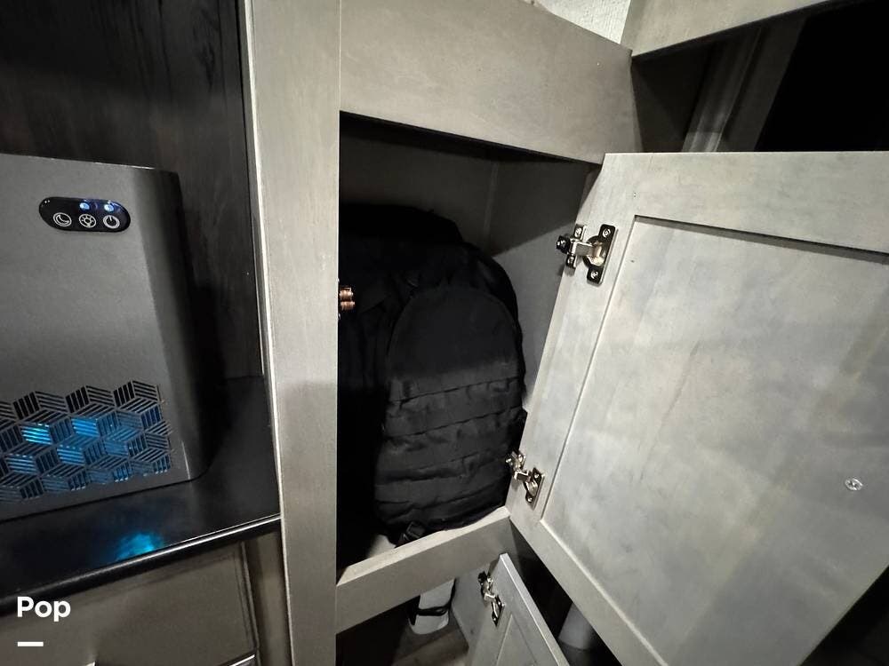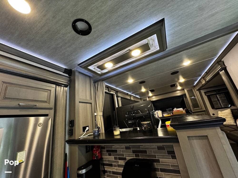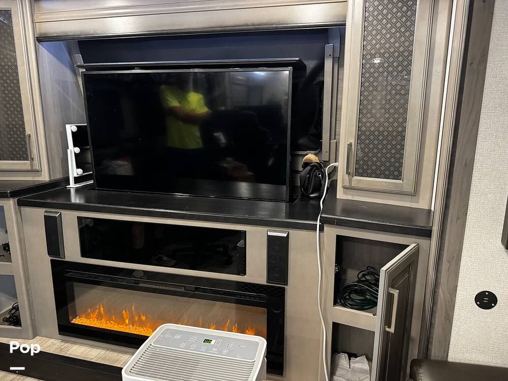 Upon entering, you'll be greeted by the elevated front living area, designed to maximize relaxation and entertainment. Two comfortable sofa sleepers and plush theater seats provide the perfect setting for unwinding after a day of adventure. With panoramic windows surrounding the space, you'll enjoy sweeping views wherever you park. The entertainment center, with a cozy fireplace and a televator, sets the mood for intimate evenings with friends and family.